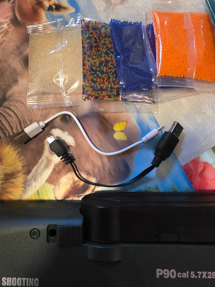 Gel Blaster P90 cal 5.7X28 with accessories. Included are different coloured gel beads and charger