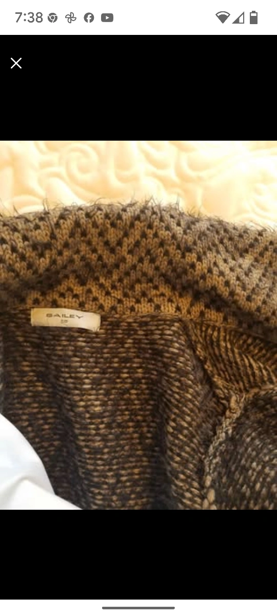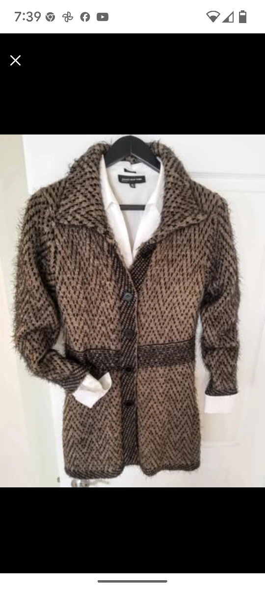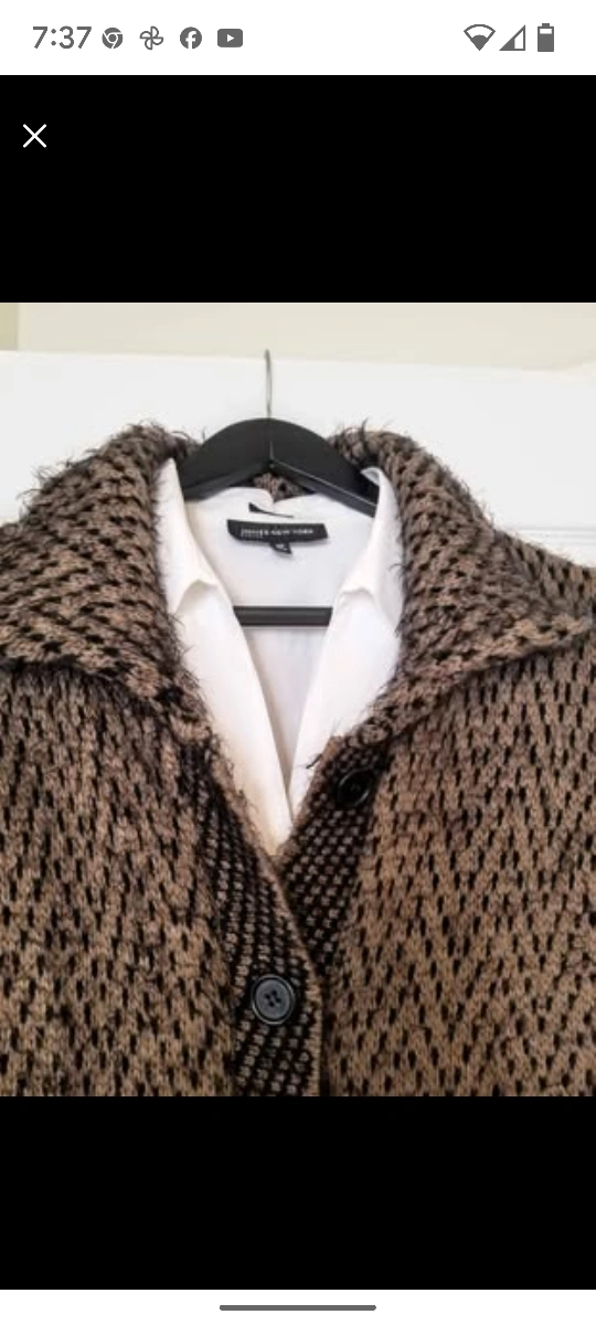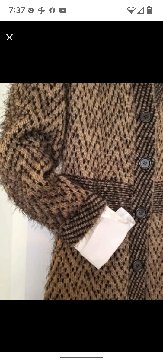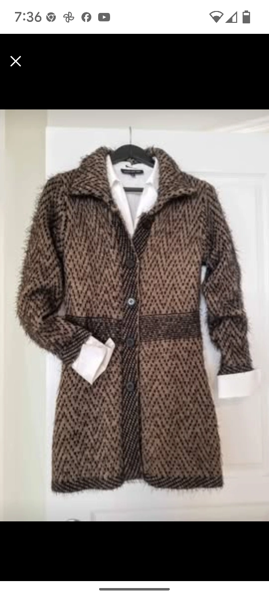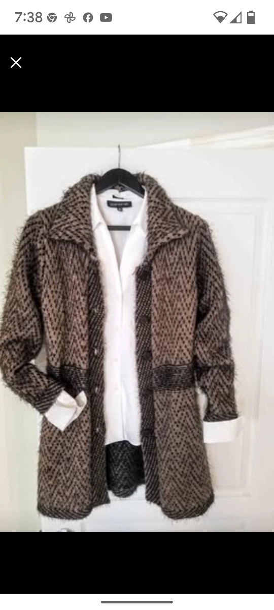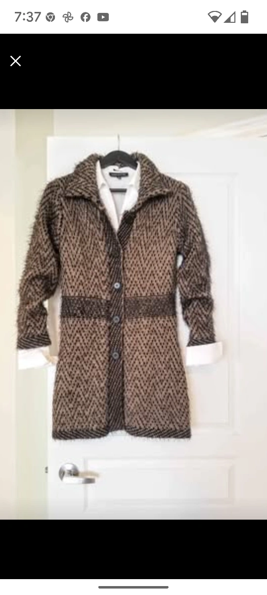 This beautiful duster/ long cardigan is brand NEW, never had the chance to wear it. Perfect for a warm cover up, it has a good weight to it. The color is an elegant combination of black, brown and taupe. Very chic and stylish and very very SOFT. I bought it for $200. The brand is Bailey by the Canadian designer Brian Bailey. Too bad it is too long for my height especially that I stopped wearing heels after my foot injury. I'm only 5'. The size is a generous small and it has a good give to it. I wear size 8-10 and it fits me perfectly. Ps, the actual color is muted taupe and you can see the true color of you zoom in on the collar. For some reason the color of the body is being photographed close to honey brown but it's not. 50% acrylic, 40% polyamide and 10% polyester. The white shirt is not included. it's for display only. pickup in Richmond Hill.