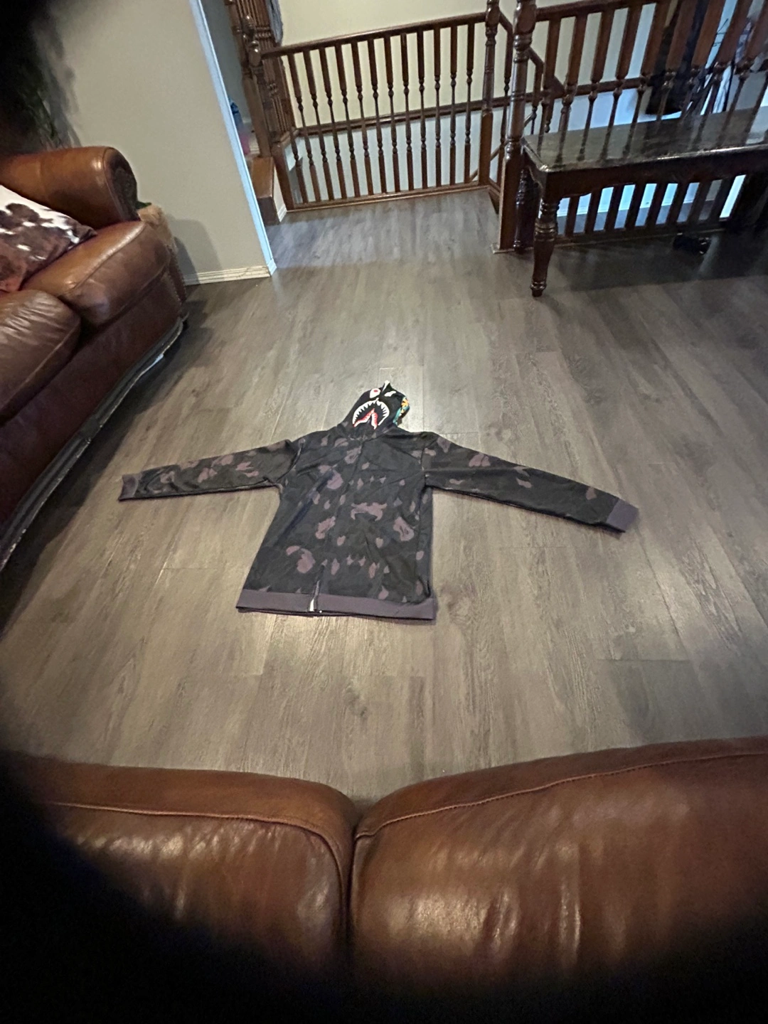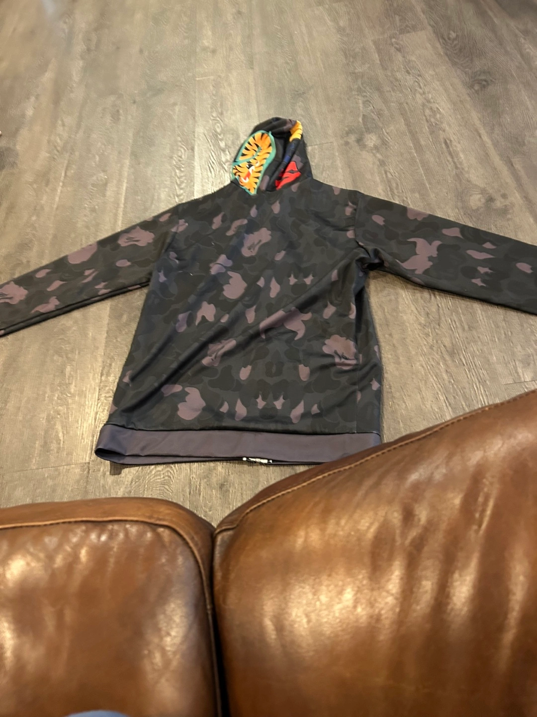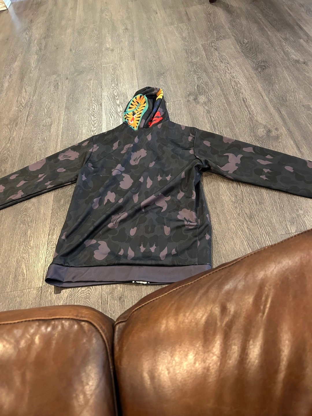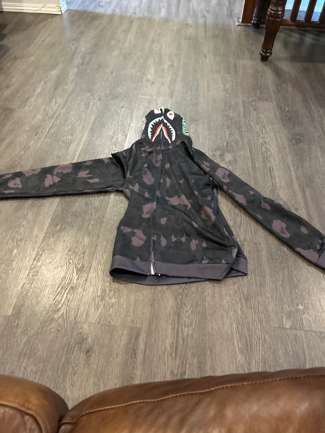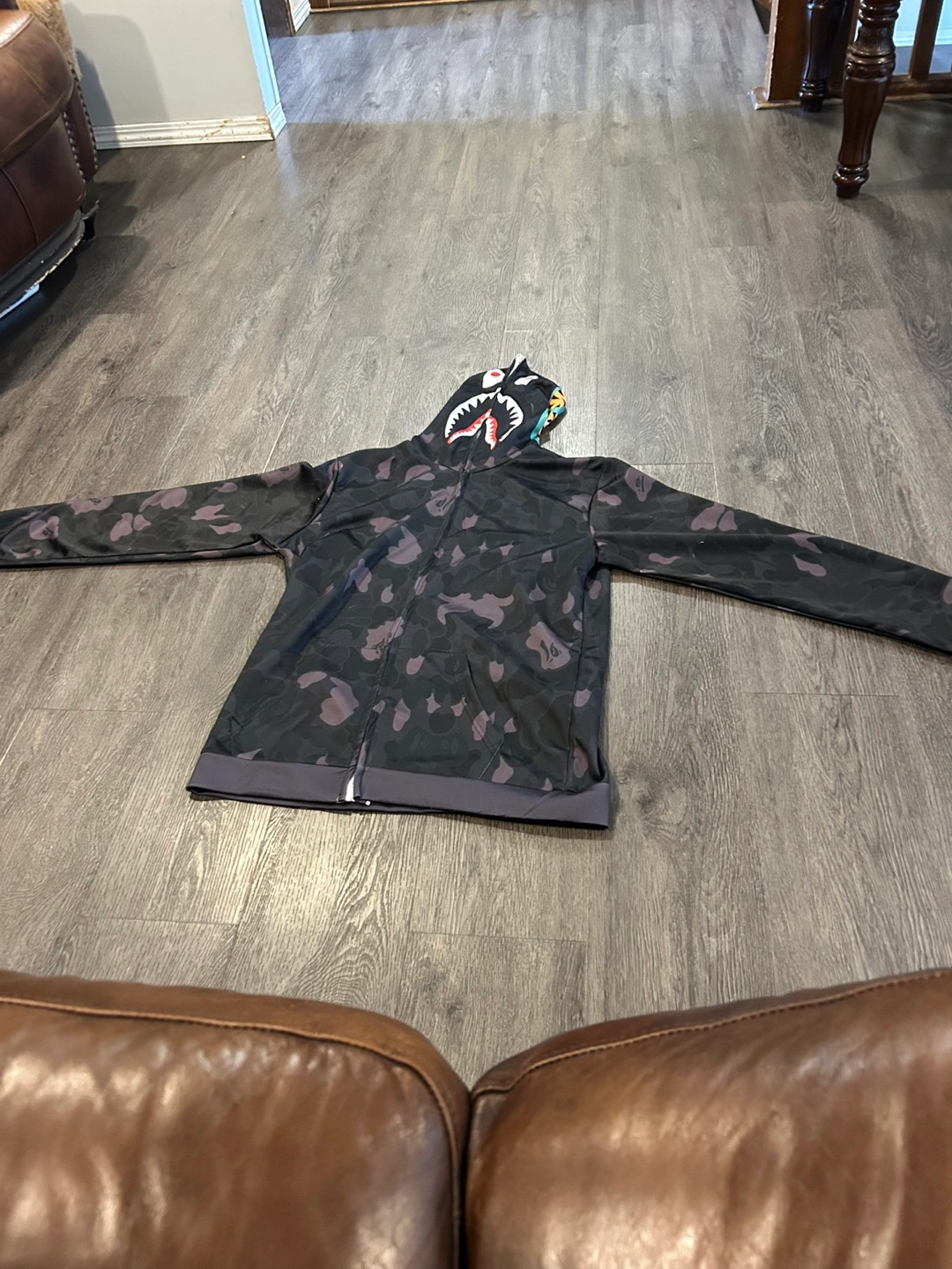 Brand new BAPE-style shark hoodie in a black and brown camo print with the classic full-zip shark face design on the hood. Never worn and in perfect condition. This is a replica, not authentic BAPE, but it still has that bold, streetwear look. • Brand: BAPE (replica) • Size: Tag says “7” — fits like a men’s small (for kids, likely fits ages 10–12 depending on size) • Condition: 10/10 brand new • Material: Lightweight — good for spring, fall, or indoor wear (not meant for cold winter weather) • Style: Full zip, camo print, shark face hoodie with WGM patch on the side Trying to get rid of it ASAP
