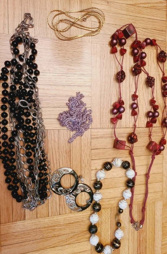 a mixed lot of necklaces and earrings! There's a variety of styles and colours, perfect for adding some flair to your outfits. Includes beaded necklaces, chain necklaces, and statement earrings. All in good condition and ready for a new home. Free with $25 purchase