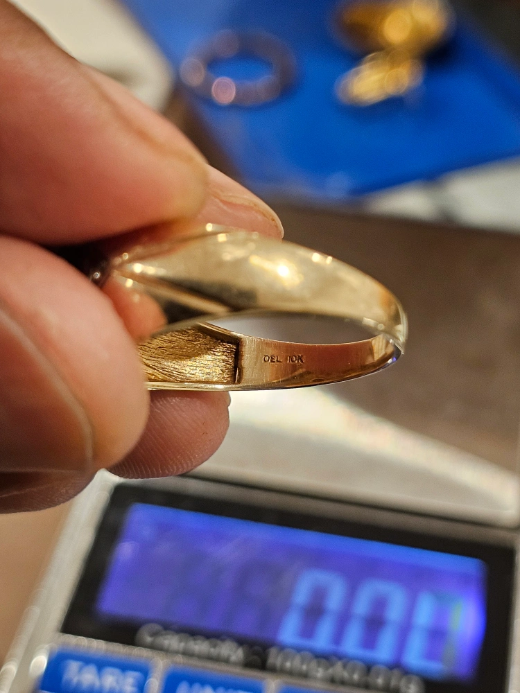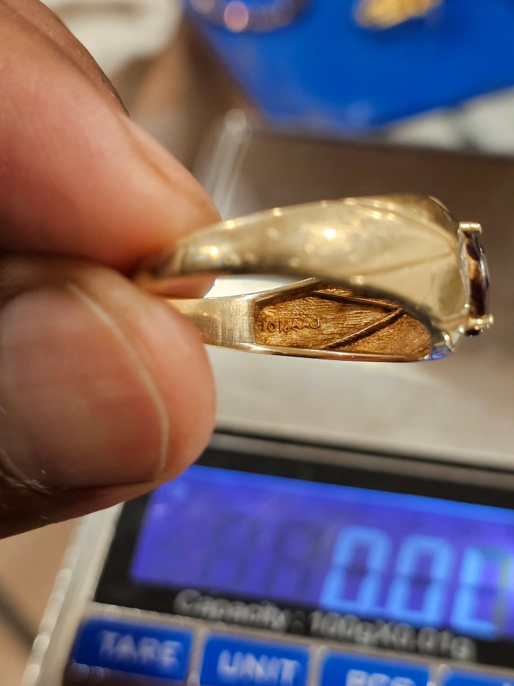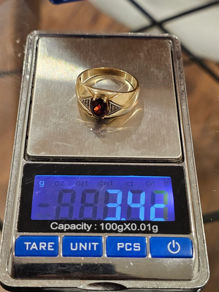 Selling a DEL 10K gold ring. It has a red stone. It weighs approximately 3.4 grams. have Garnet in it . Size 9-10 CHECK MY OTHER LISTING TOO