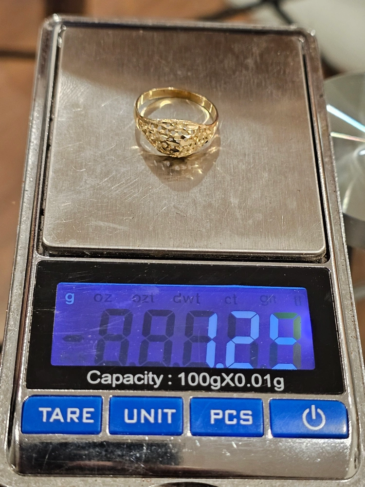Selling a solid gold ring, as pictured. It weighs 1.2 grams according to the scale in the photo. CHECK MY OTHER LISTING TOO