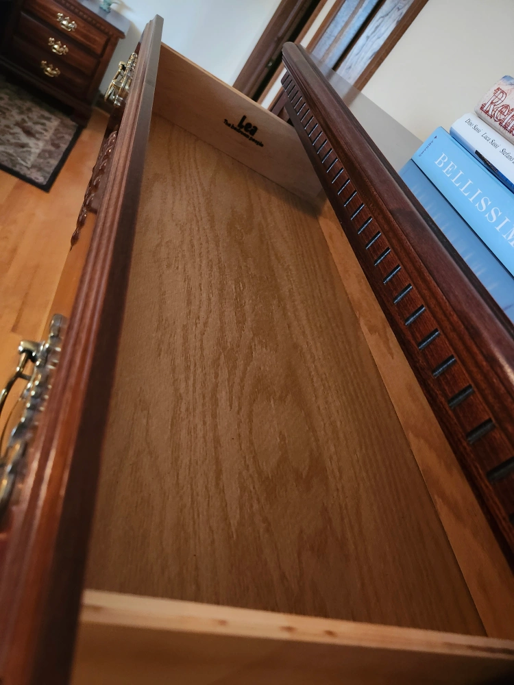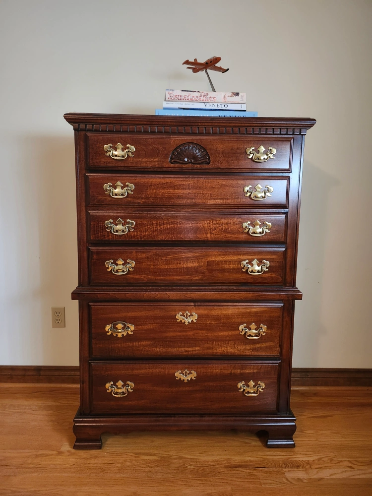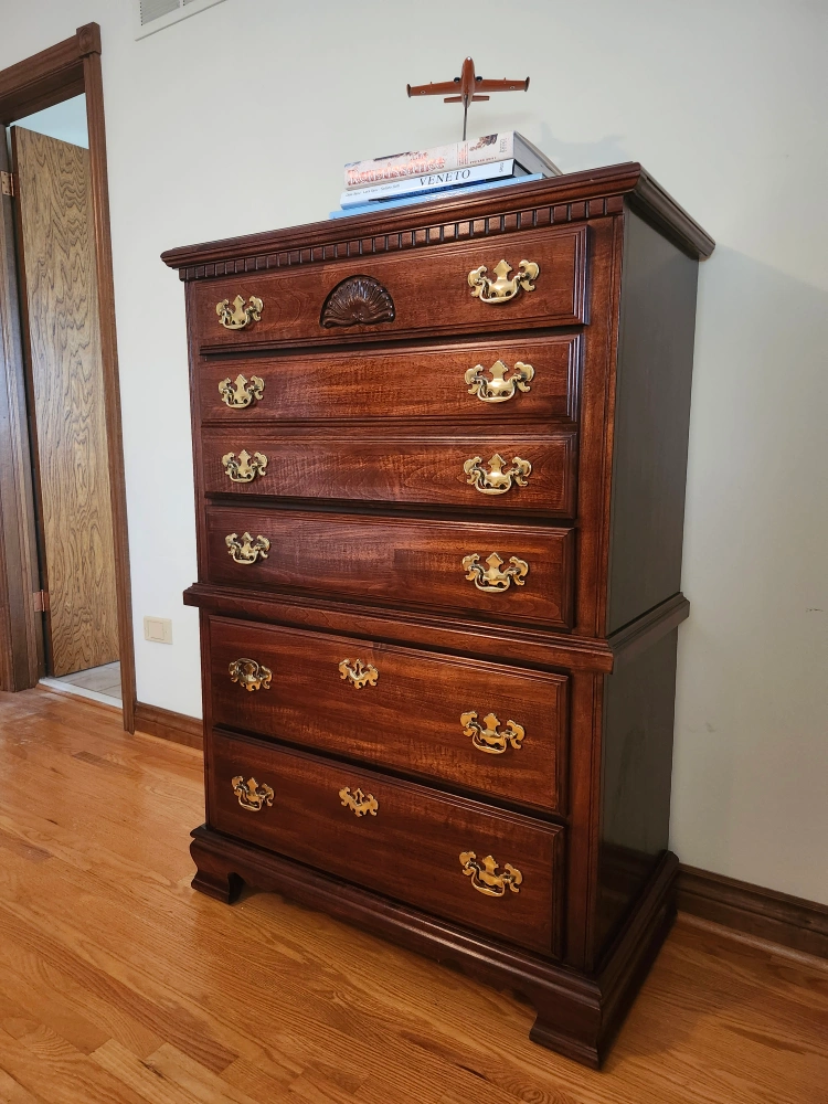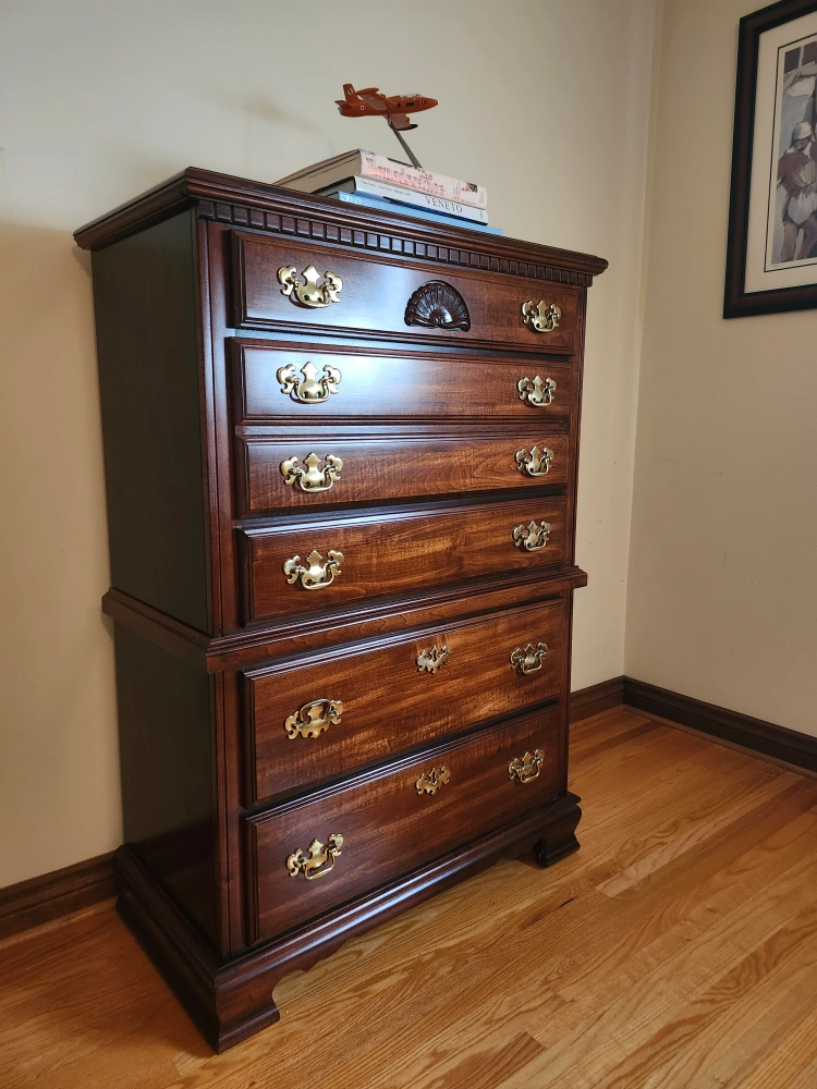 A lovely solid wood wardrobe by Lea Furniture. It features a rich, dark wood finish and classic hardware. It's a great piece to add some storage and style to your bedroom or living space. Matching bedroom set also available (bed frame, side tables, mirror).