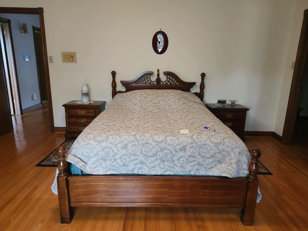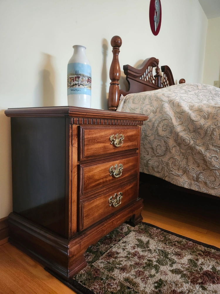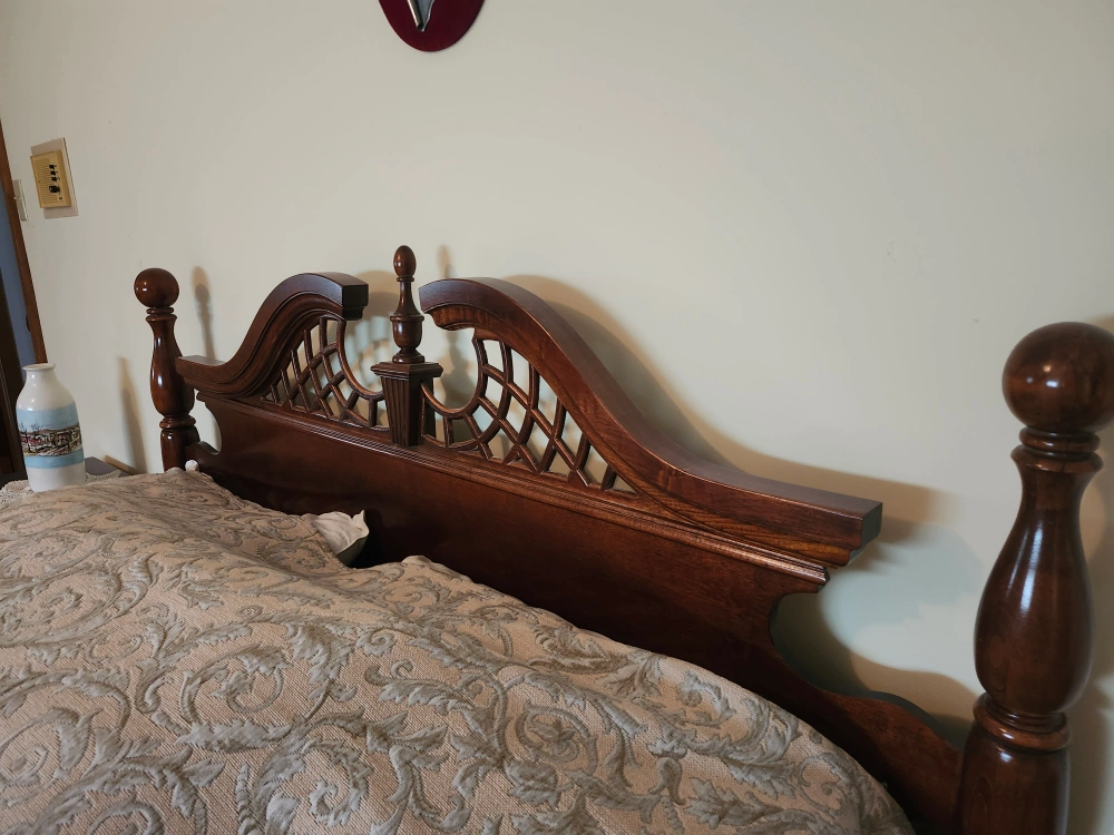 A beautiful Lea Furniture wood bed frame with matching nightstands. The bed frame features intricate detailing, and the nightstands provide ample storage. Bed Frame: Queen Bed ($100) Nightstands [×2]: 24"D × 16"W × 25"H ($25 each)