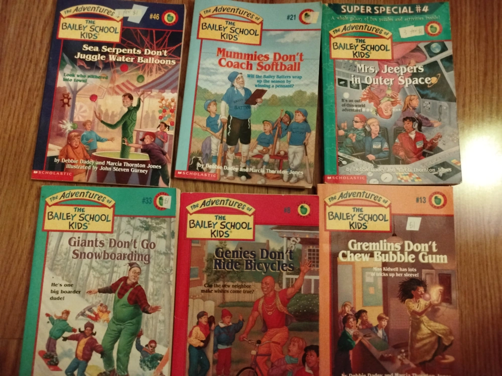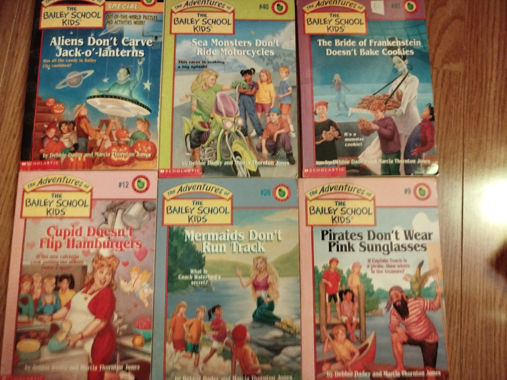 Selling a collection of "The Adventures of the Bailey School Kids" books by Debbie Dadey and Marcia Thornton Jones. Great for young readers! Titles include: - Sea Serpents Don't Juggle Water Balloons - Mummies Don't Coach Softball - Mrs. Jeepers in Outer Space - Giants Don't Go Snowboarding - Genies Don't Ride Bicycles - Gremlins Don't Chew Bubble Gum - Aliens Don't Carve Jack-o'-lanterns - Sea Monsters Don't Ride Motorcycles - The Bride of Frankenstein Doesn't Bake Cookies - Cupid Doesn't Flip Hamburgers - Mermaids Don't Run Track - Pirates Don't Wear Pink Sunglasses $0.5 for each/ $5.00 for all together