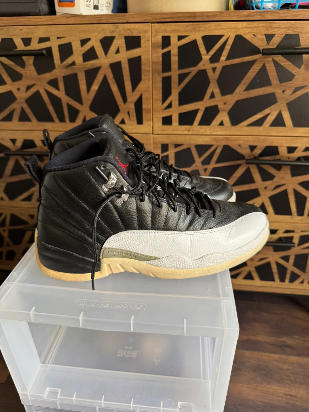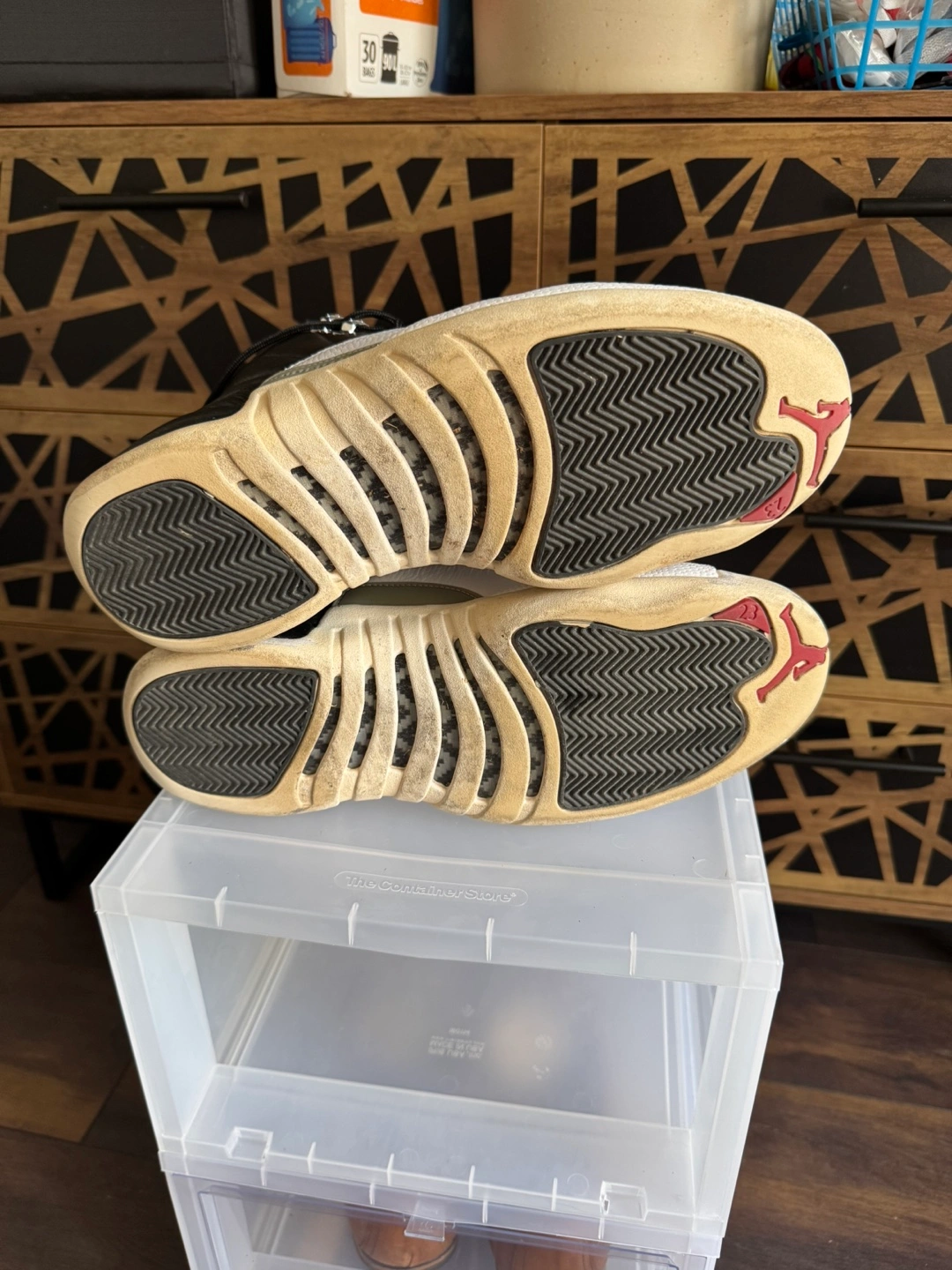 Selling a pair of Jordan 12 Retros in black and white. They have been worn, as you can see from the soles, but still have lots of life left!