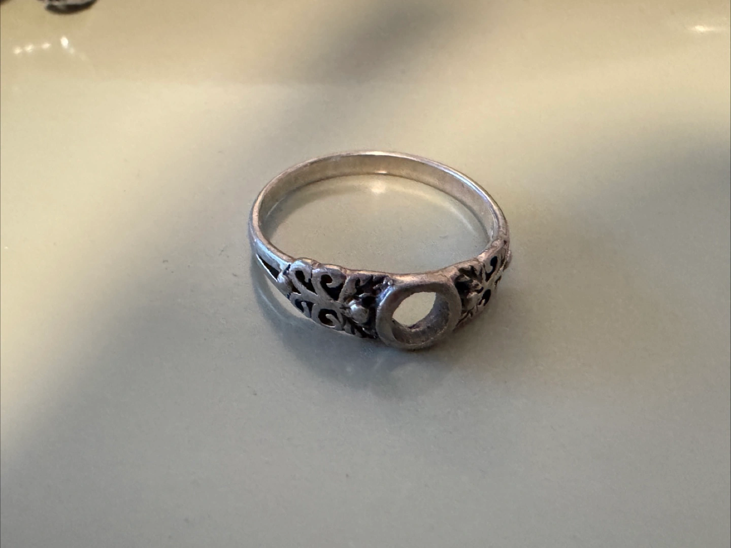 Selling a silver ring. It has a delicate design around the band. Perfect for adding a touch of elegance to any outfit