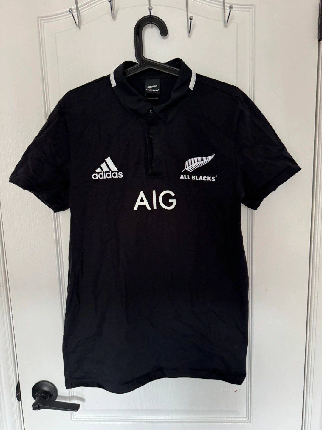 Selling an Adidas All Blacks rugby polo shirt in black. It features the Adidas logo and the All Blacks logo. Perfect for any rugby fan!
