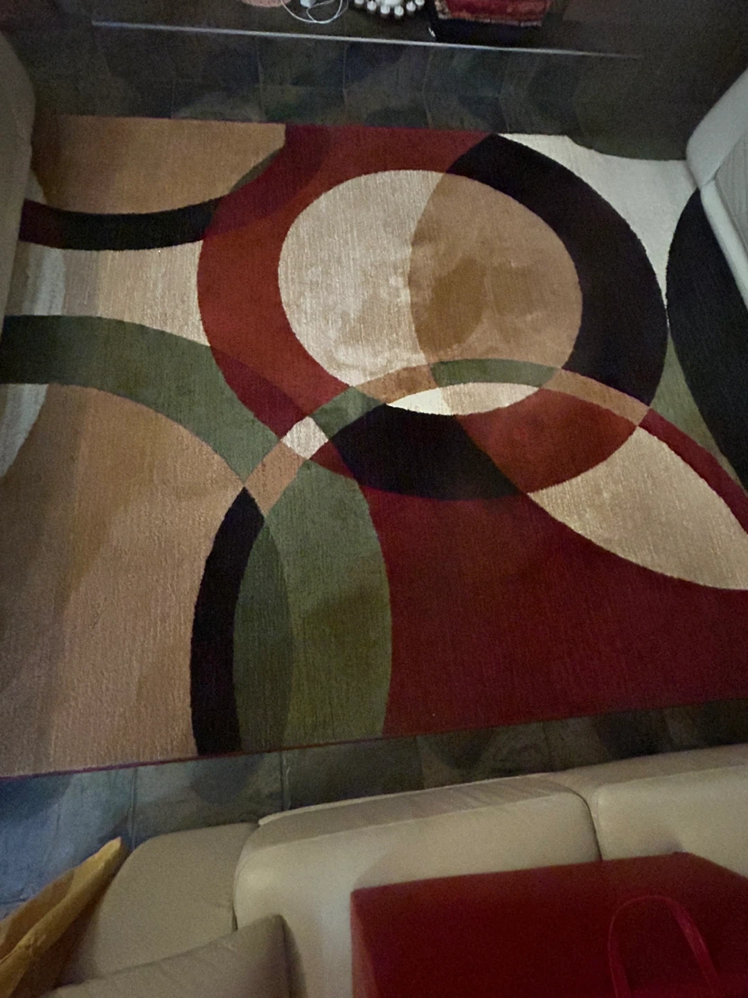 Area rug with a geometric pattern in shades of red, brown, green, and black. It appears to be in good condition and would add a stylish touch to any room