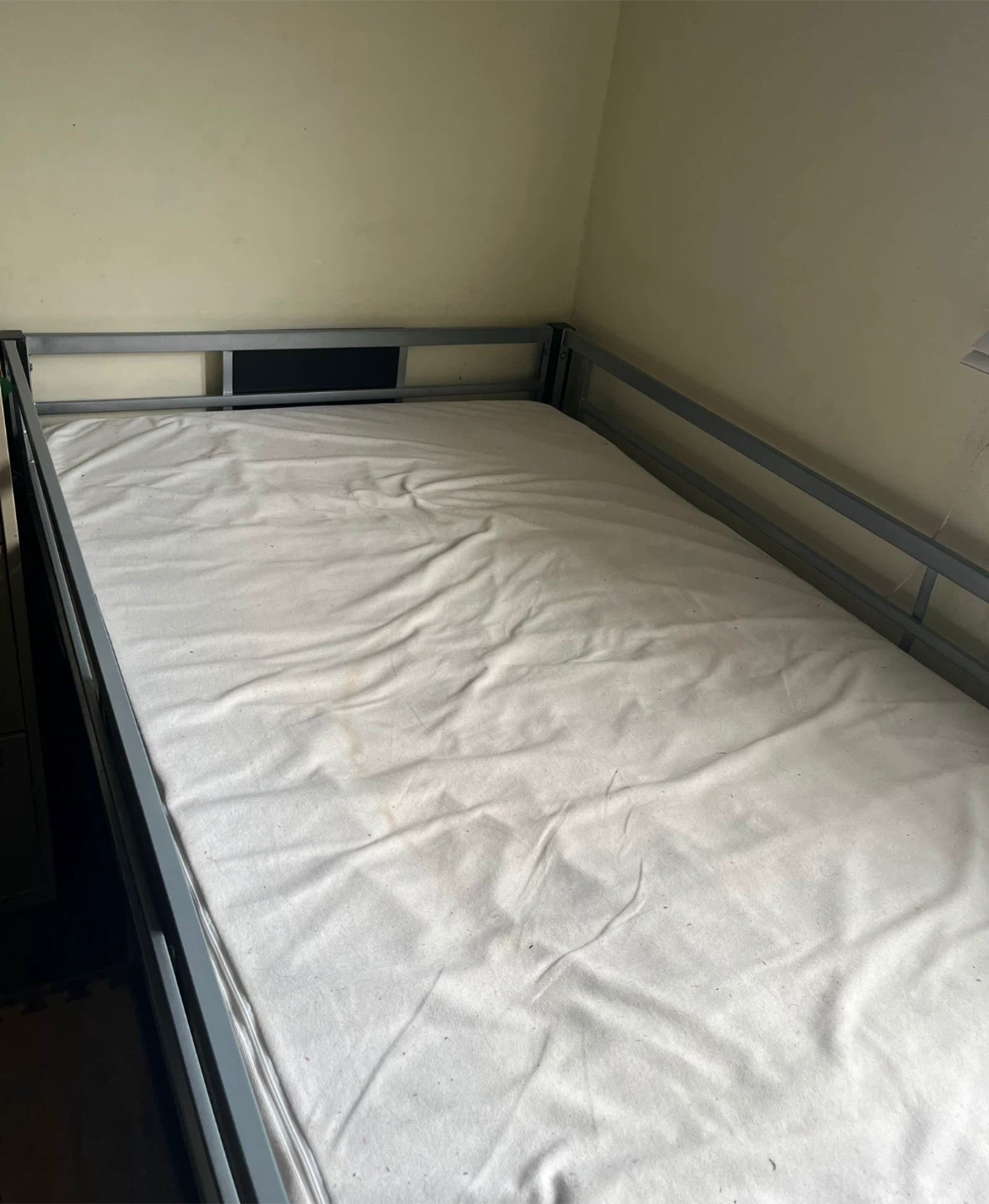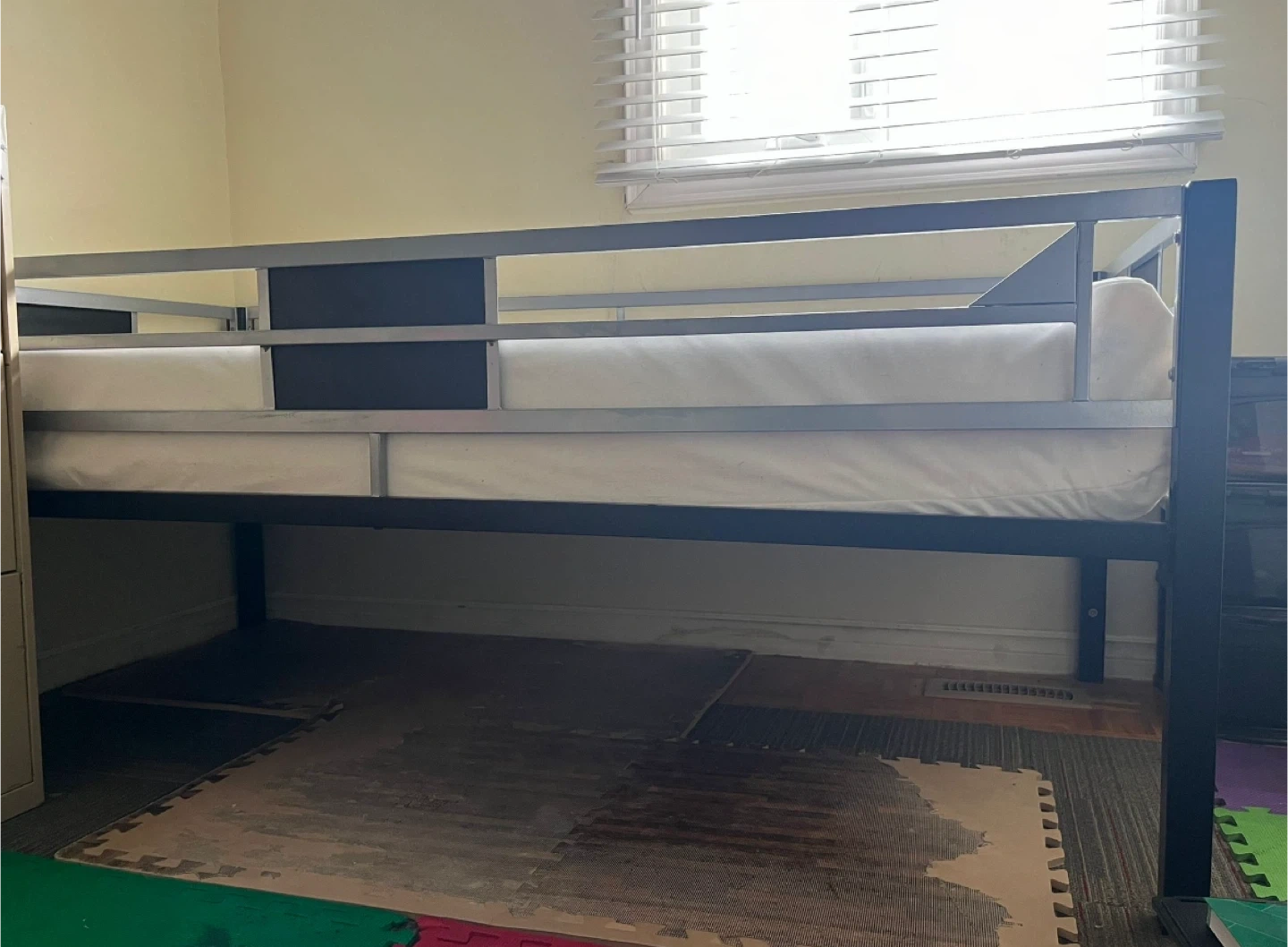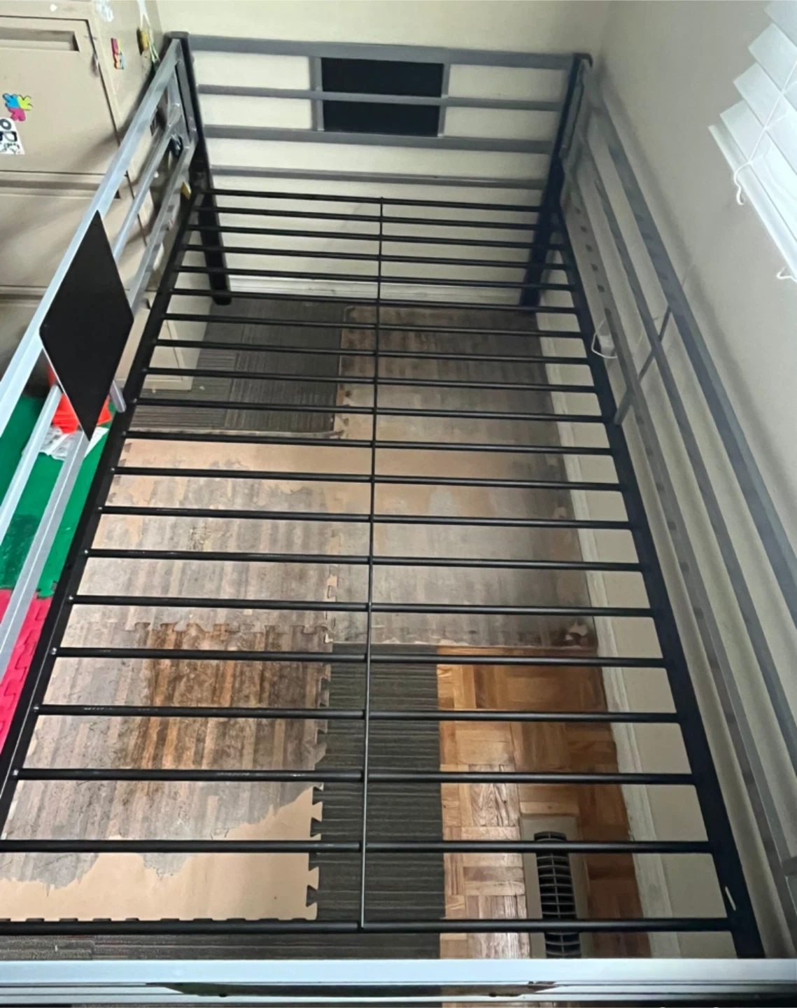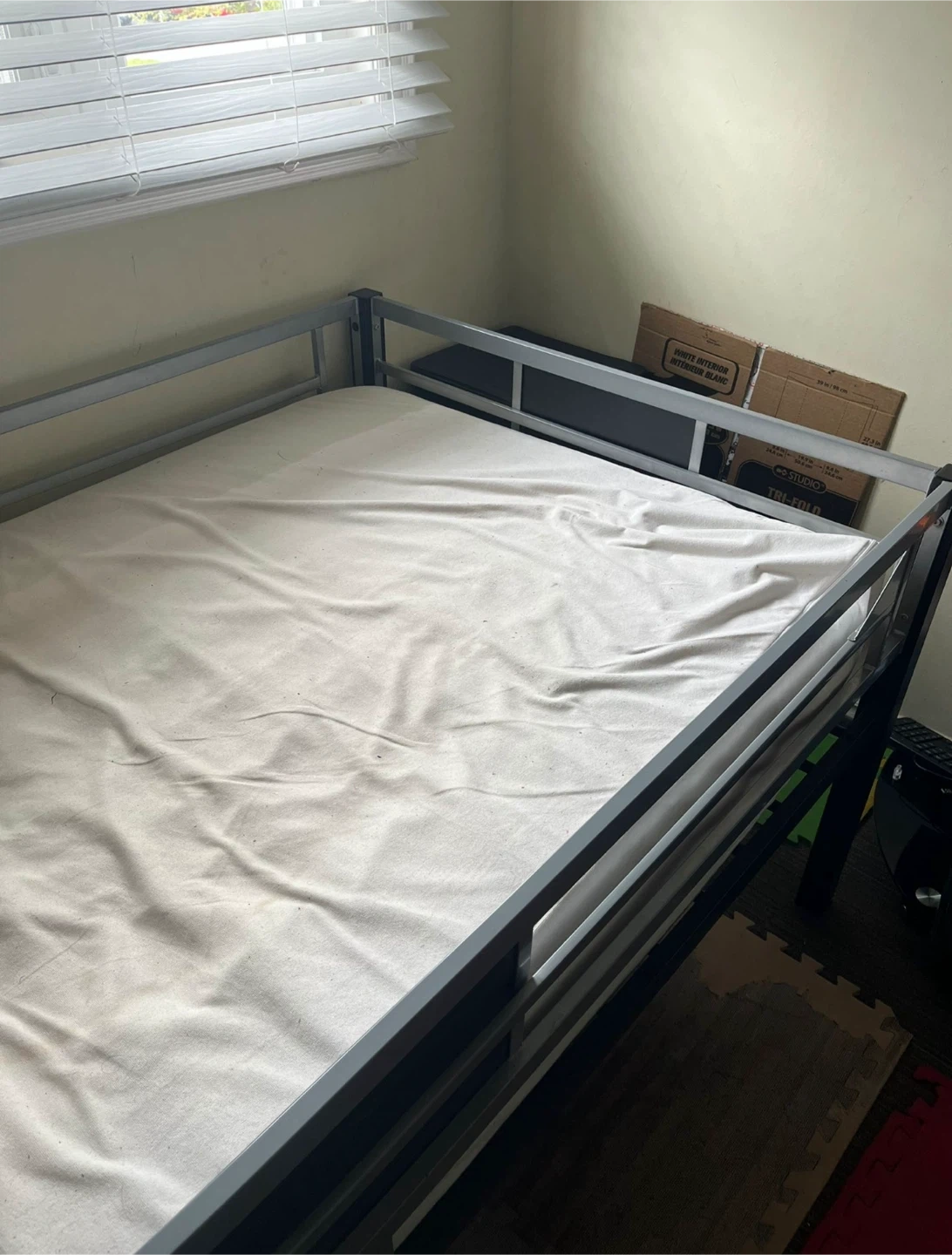 Selling a twin size metal loft bed frame. It's in good condition and ready for a new home! The dimensions are 77.5 inches (W) x 41.5 inches (D) , lots of storage space under neath, metal frame guards around bed for extra protection and ensure safety of your loved ones from falling while asleep ๐ค. Mattress is not included.