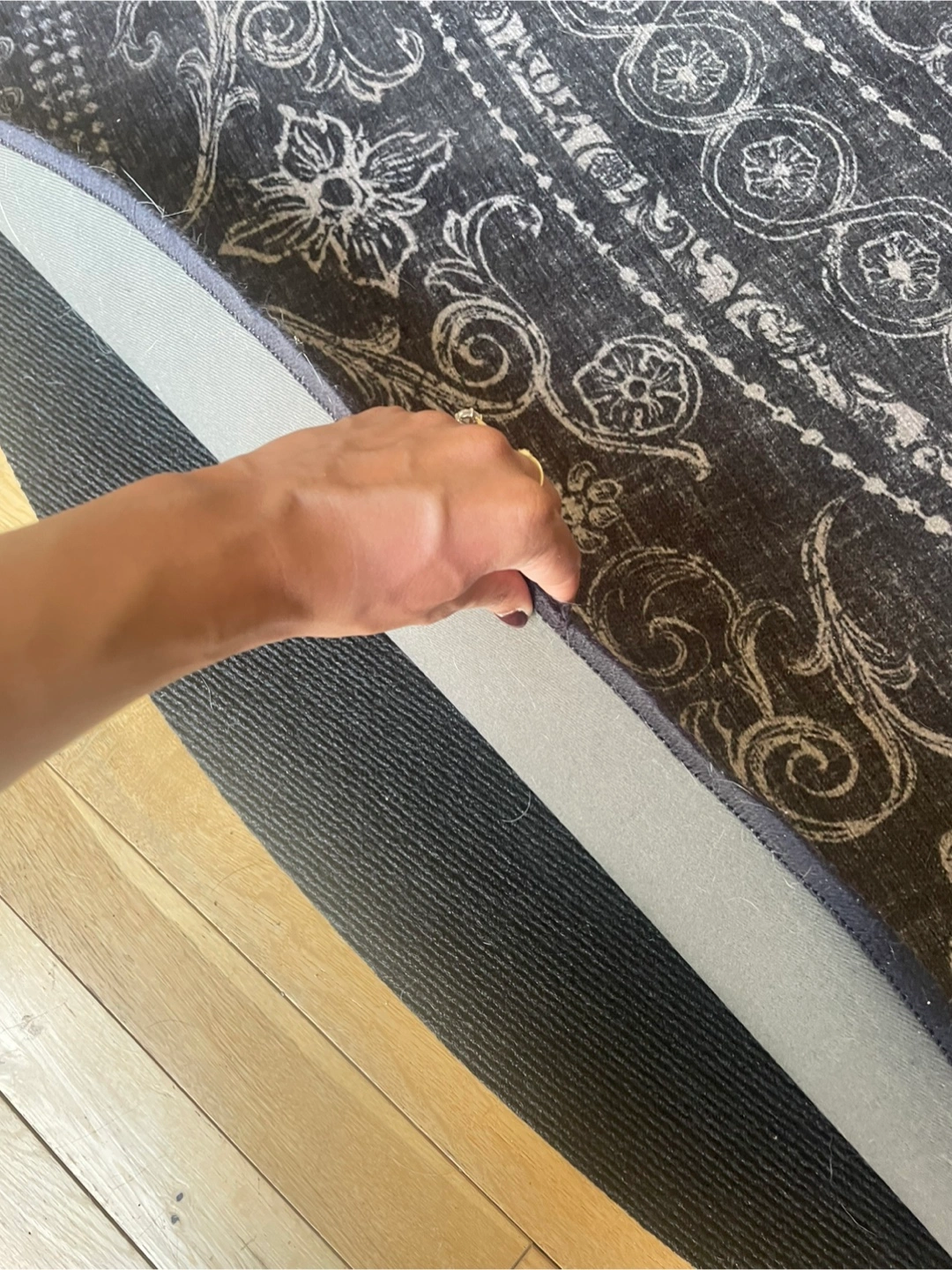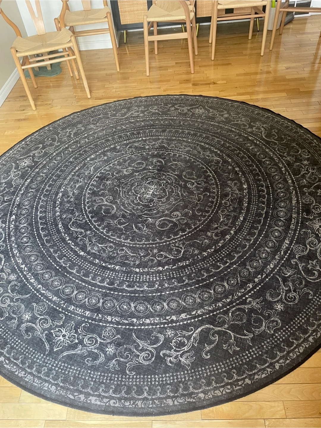 Selling a round area rug in a black and white pattern. It's in great condition and is washable. It comes with an anti slip mat to keep the rug in place.