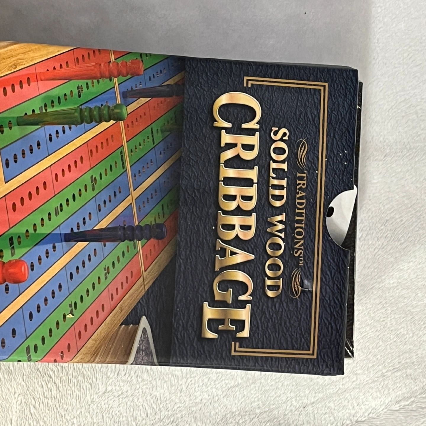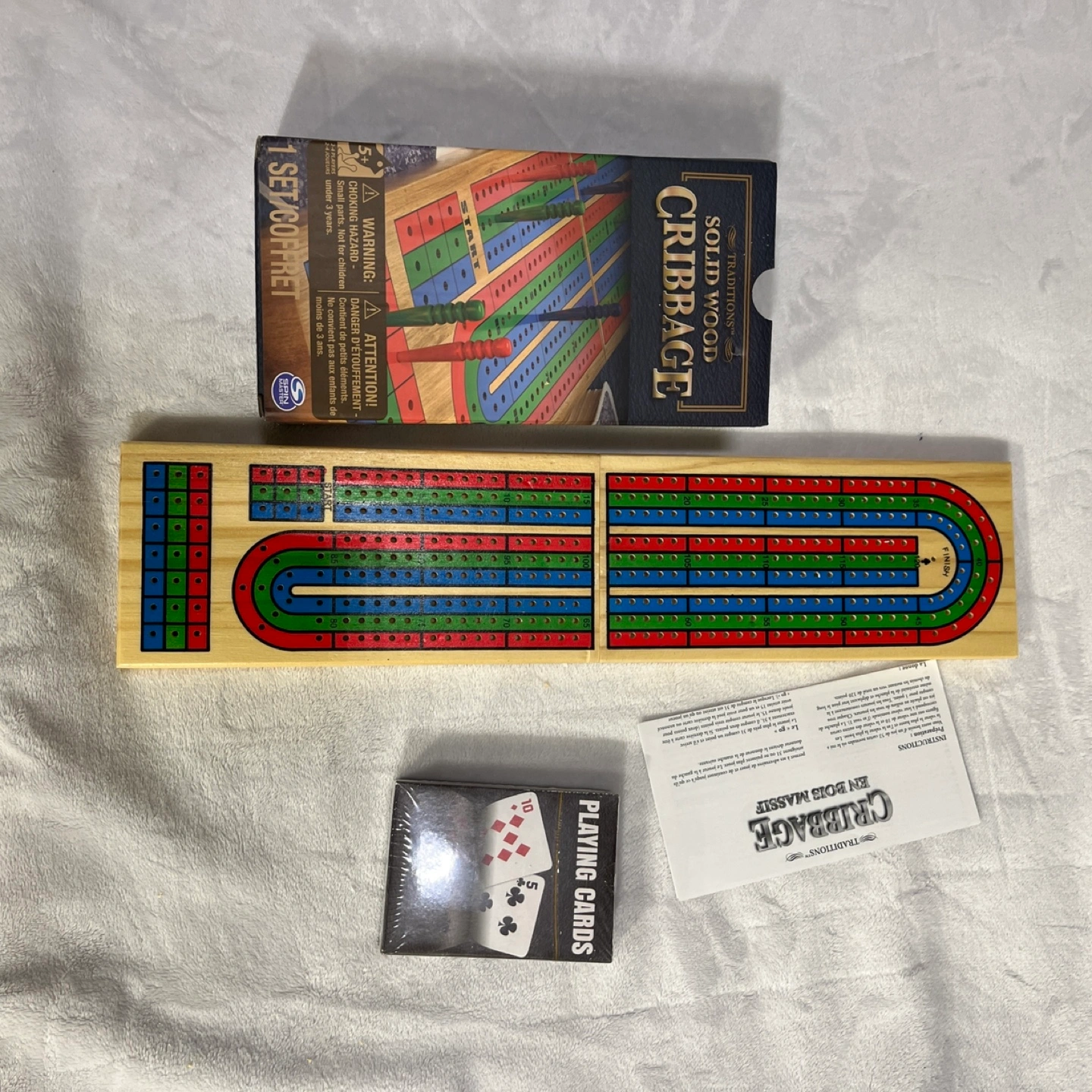 I'm selling a brand new Traditions Solid Wood Cribbage set! It includes: - Solid wood cribbage board - Playing cards - Pegs - Instructions Perfect for family game night