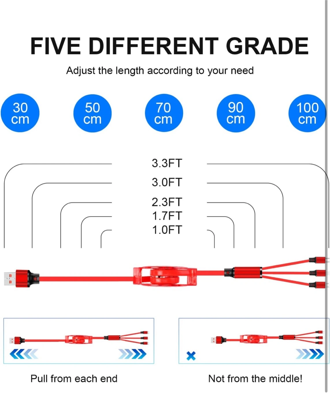 Check out this handy Yifchoti retractable multi charging cable in red! It's perfect for charging multiple devices at once. The cable is retractable, making it easy to store and carry around. It features five different length options, ranging from 30cm to 100cm.