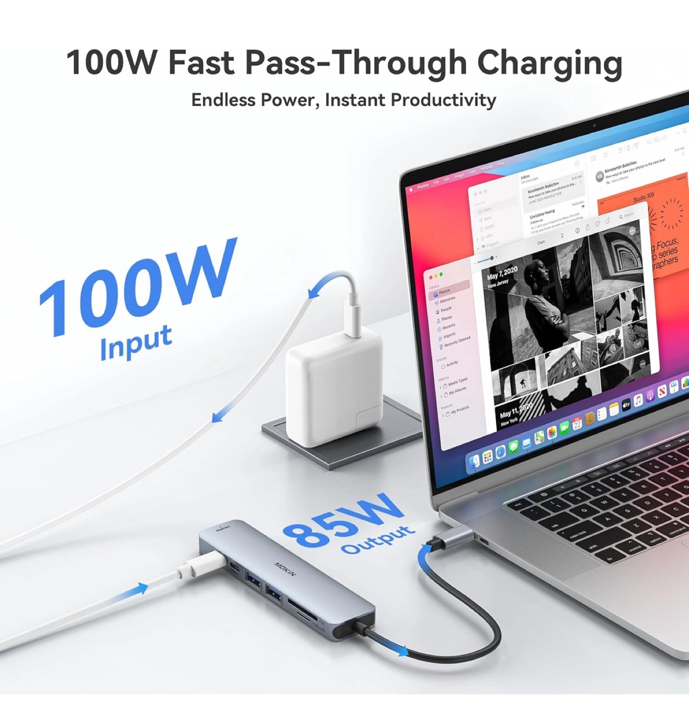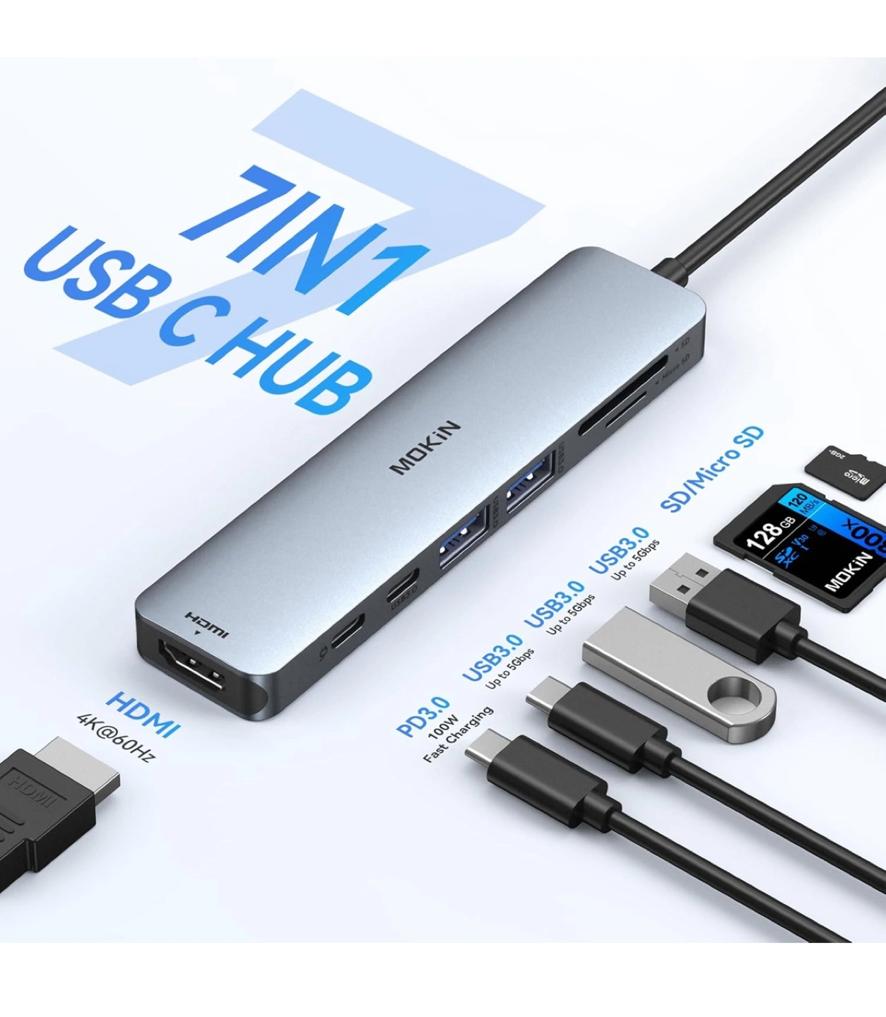 Selling a MOKIN 7-in-1 USB C Hub in excellent condition! Key features include: - 100W Fast Pass-Through Charging - HDMI 4K@60Hz - USB 3.0 up to 5Gbps - SD/Micro SD card reader Perfect for expanding your laptop's connectivity!