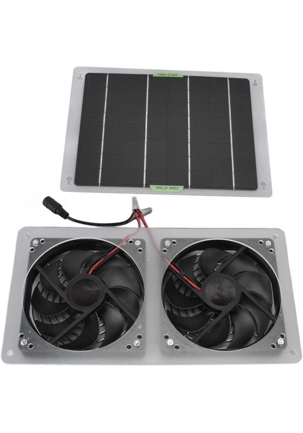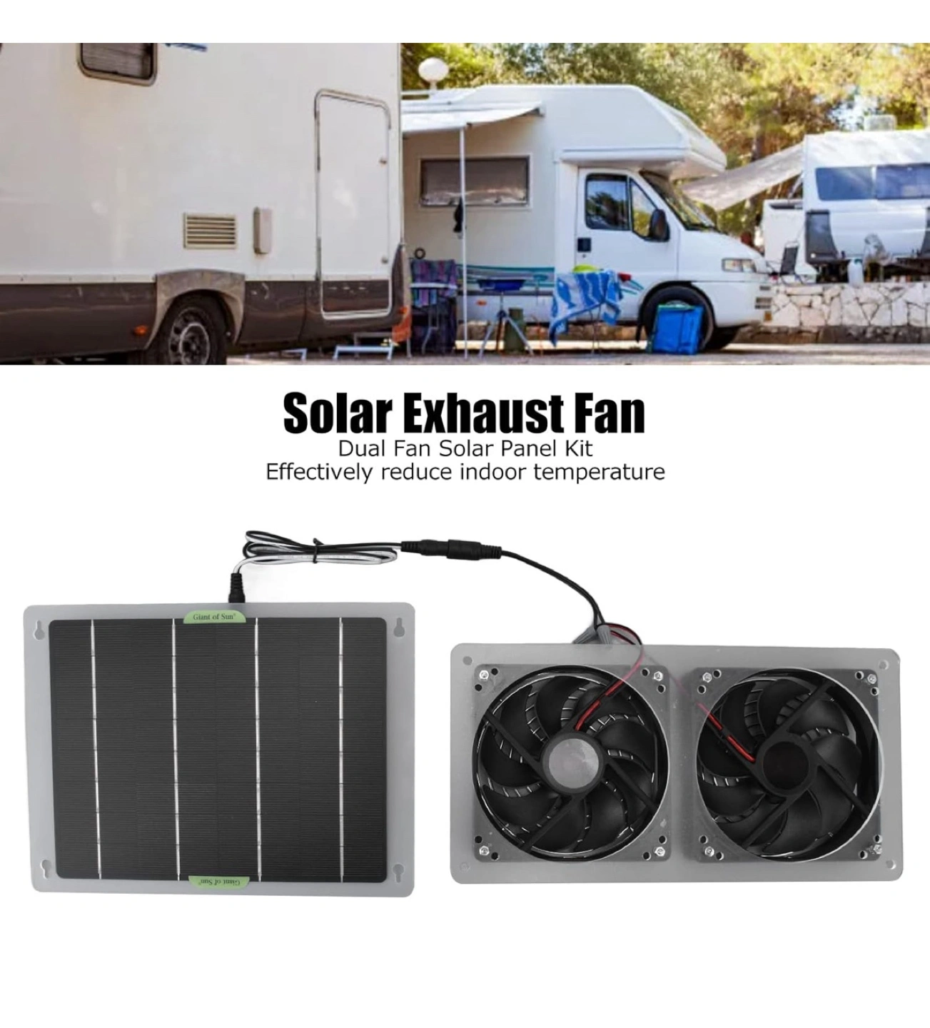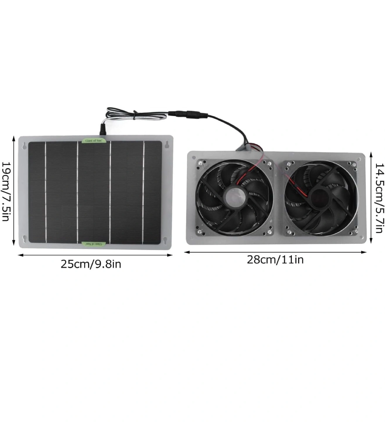 Selling a Solar Exhaust Fan, which is a dual fan solar panel kit designed to effectively reduce indoor temperature. The dimensions of the solar panel are approximately 19cm/7.5in x 25cm/9.8in, while the fan unit measures around 14.5cm/5.7in x 28cm/11in
