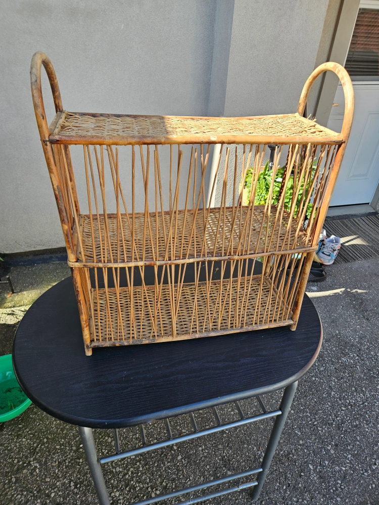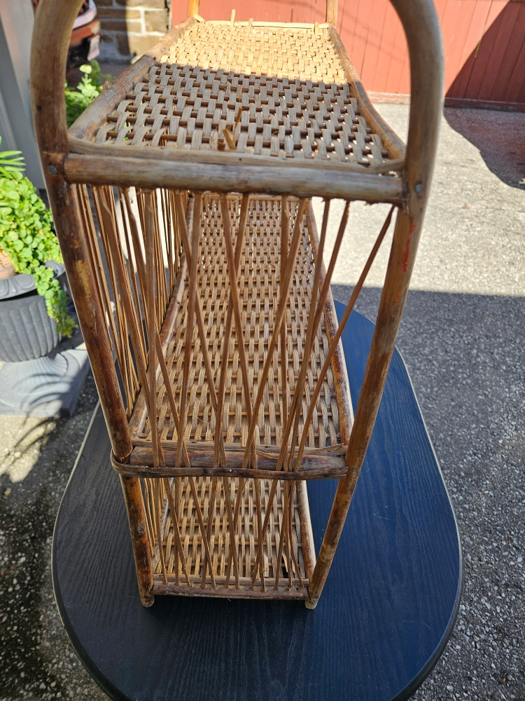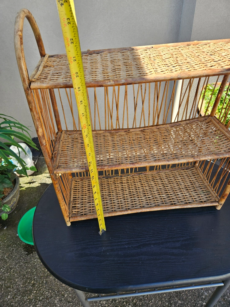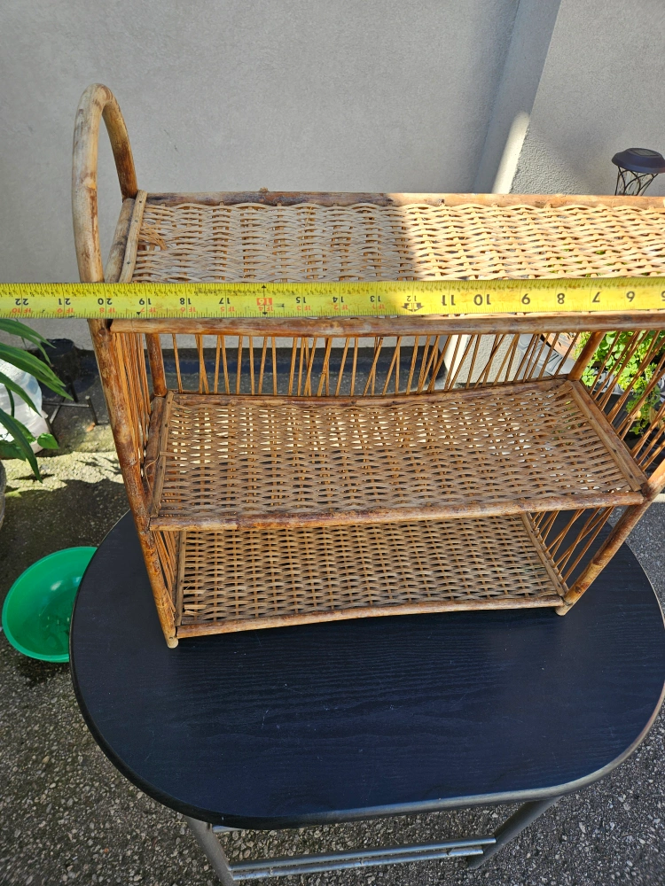 Selling a wicker shelf. It's about 22 inches wide and 19.5 inches high and has three tiers. It's perfect for adding a natural touch to your home decor!