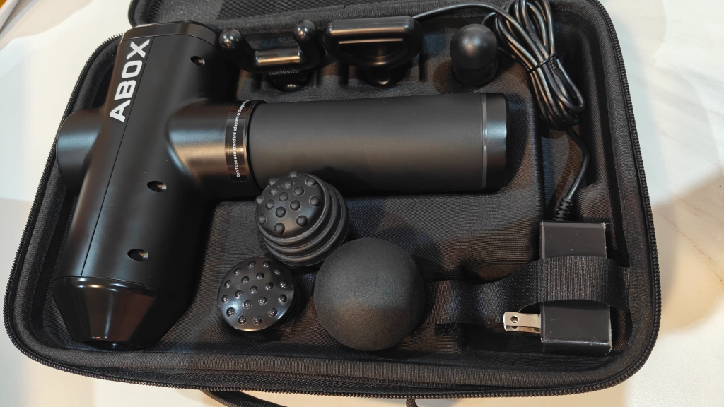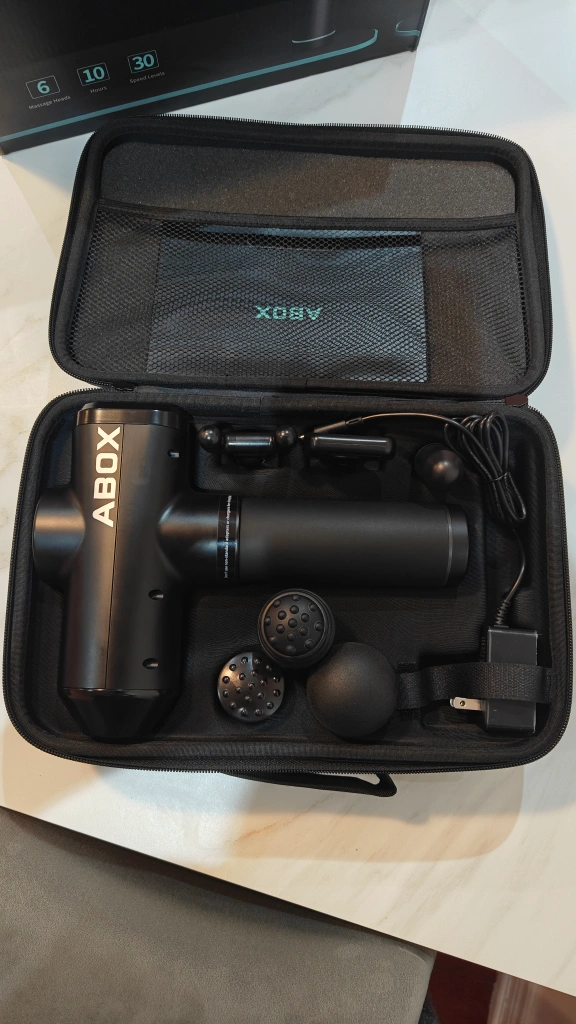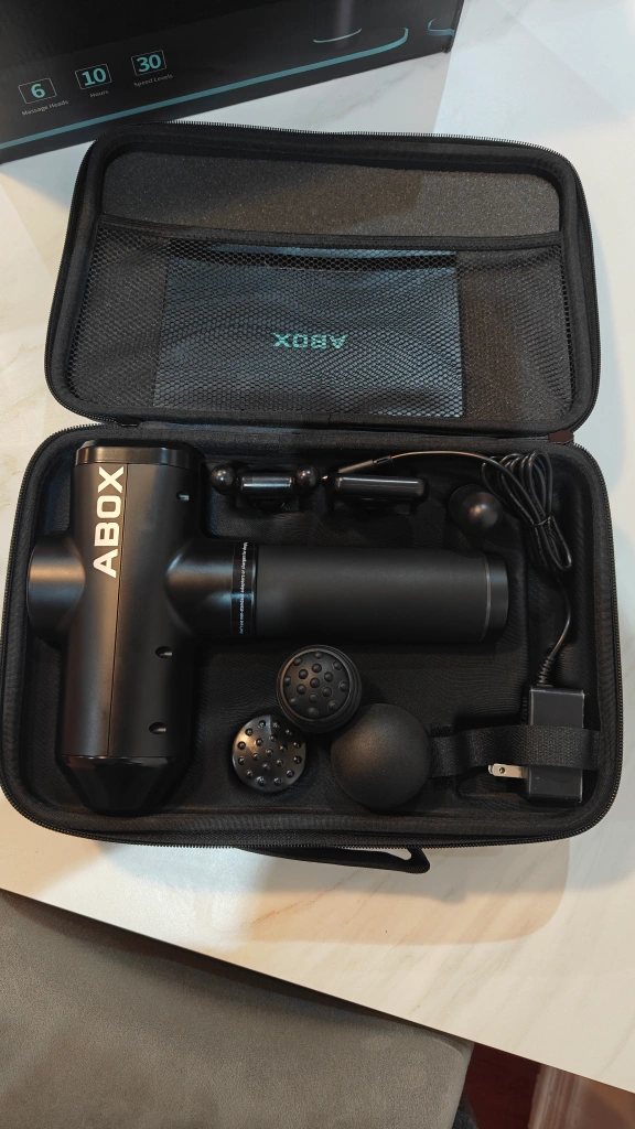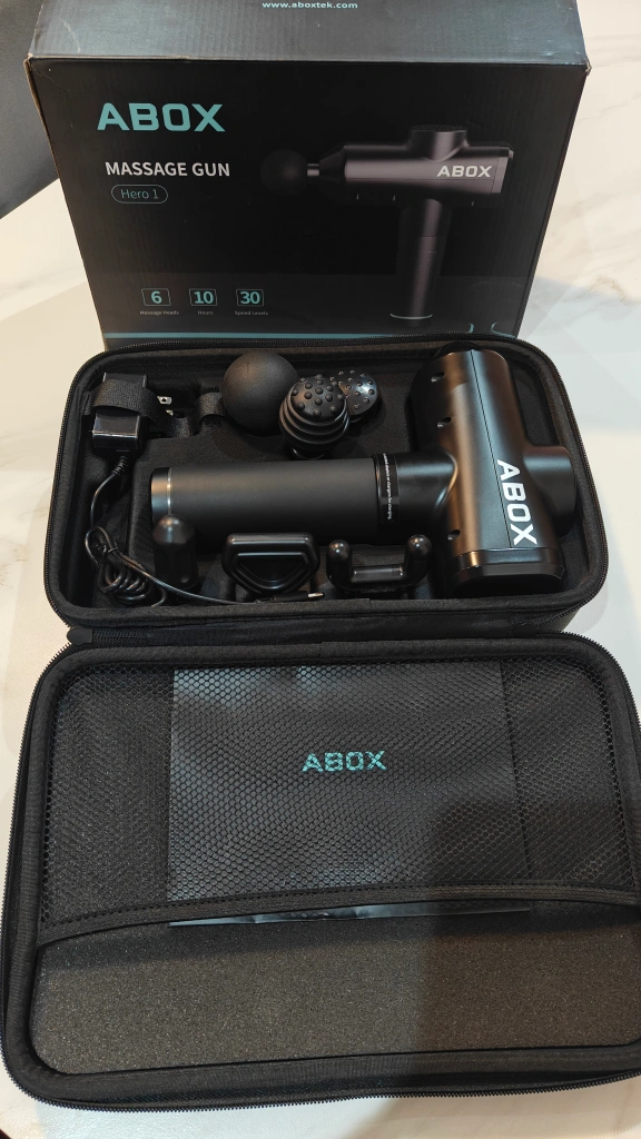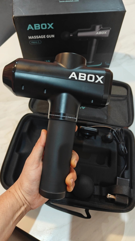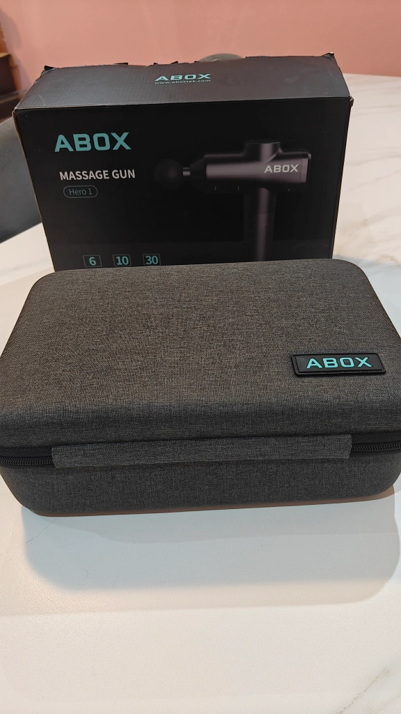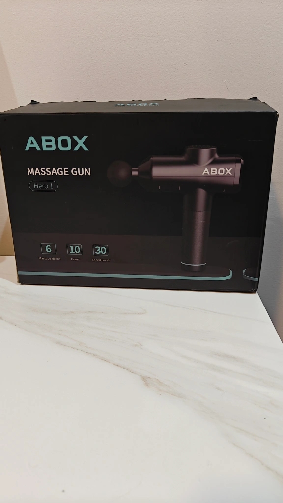 Selling an ABOX Massage Gun, model Hero 1 in black. It comes with all the attachments and the charger, neatly packed in its original box. This massage gun has 6 massage heads, 10 hours of battery life, and 30 speed levels to help you relax those muscles!