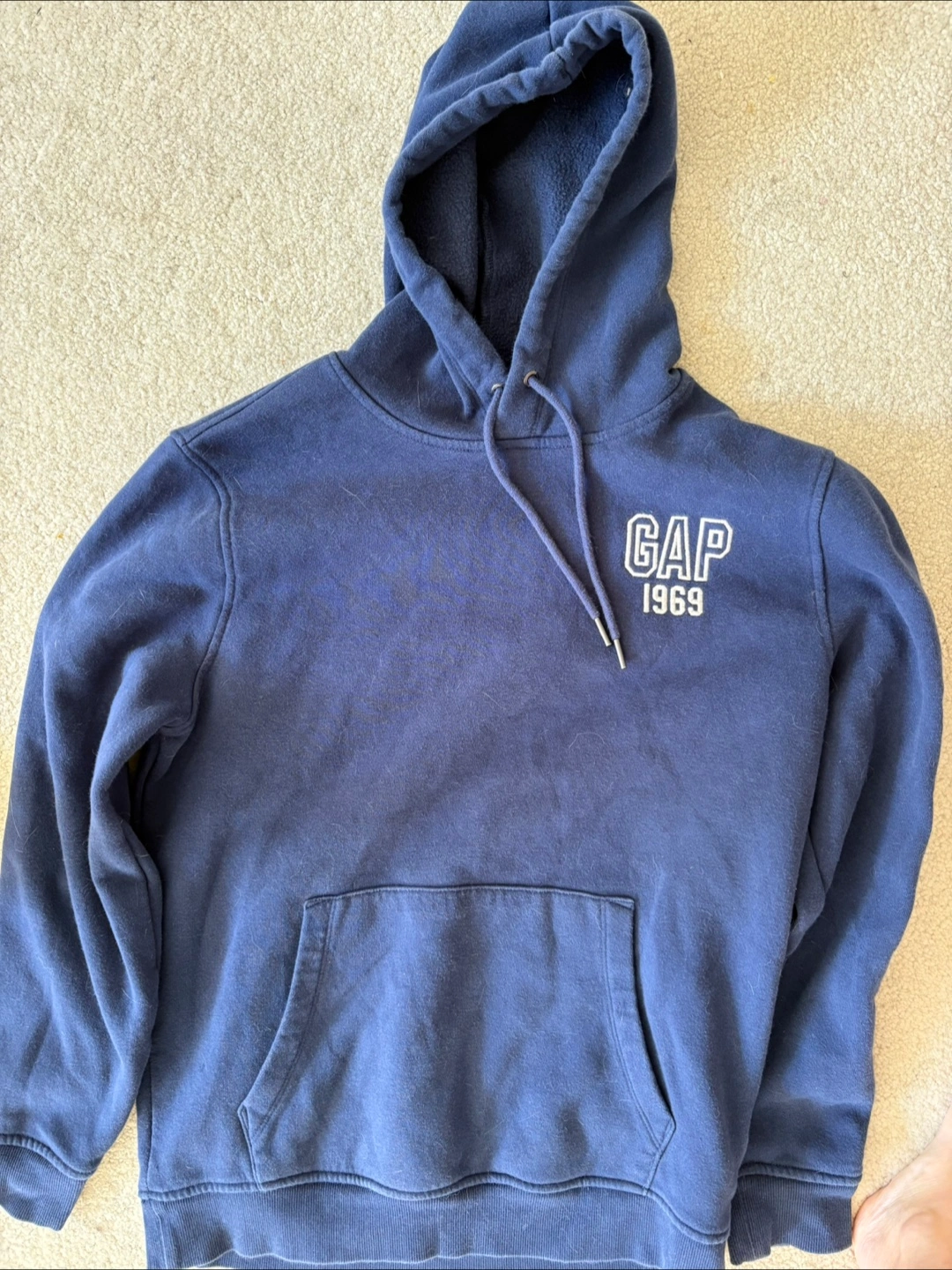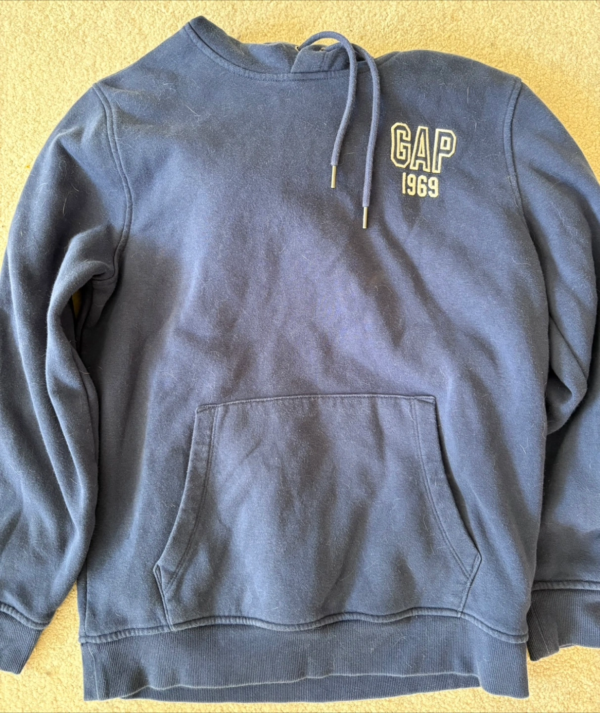 Selling a comfy GAP hoodie in a nice navy colour! It's a size small but also fits medium and has a classic GAP logo design. Perfect for staying cozy on cooler days!
