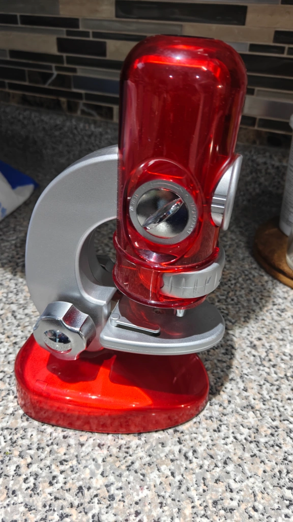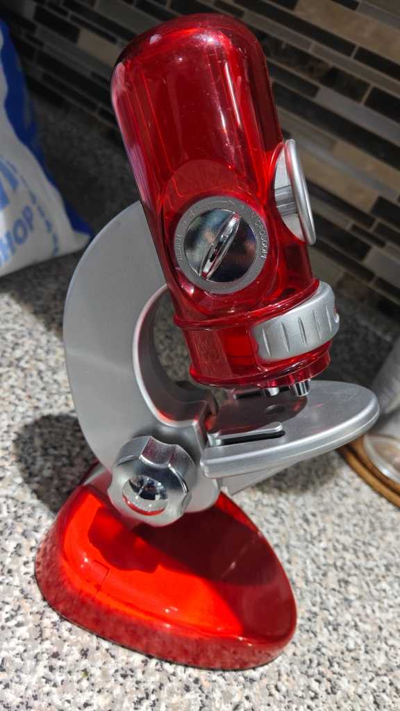 Here's a fun microscope for kids in red and silver! It's in great condition and ready for some exploring and discovery