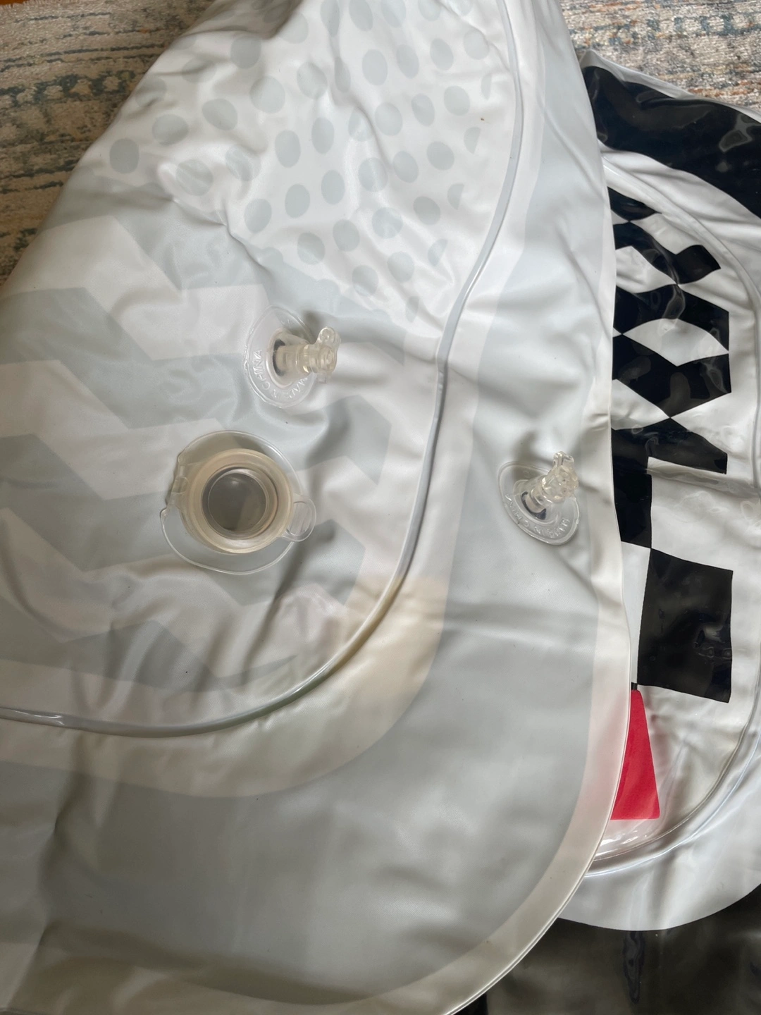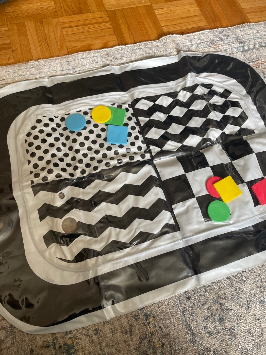 This Infantino sensory water mat is perfect for tummy time and sensory exploration! It's in great condition and ready for a new little one to enjoy. The black and white patterns are visually stimulating, and the floating shapes add an extra element of fun! It's easy to inflate and deflate for storage