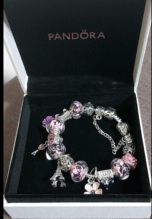 Selling a lovely Pandora charm bracelet. It comes with a variety of charms in a beautiful silver and pink colour scheme. The bracelet comes with its original Pandora box