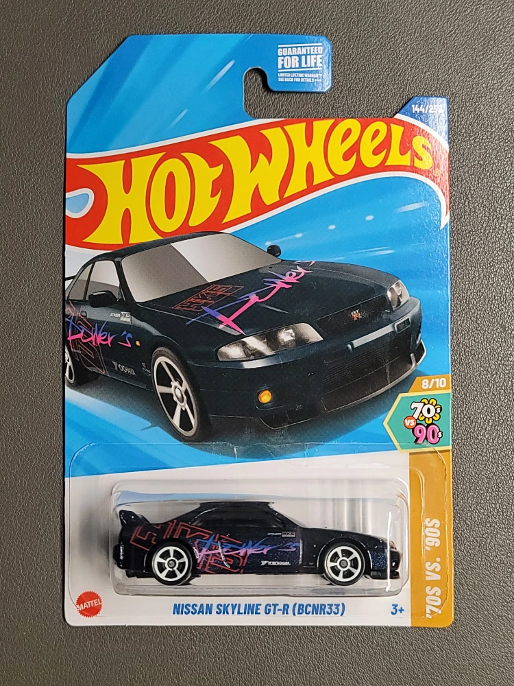 Selling a Hot Wheels Nissan Skyline GT-R (BCNR33)! This model is part of the '70s vs '90s' series. It is unopened and in great condition, ready for a collector or a kiddo!