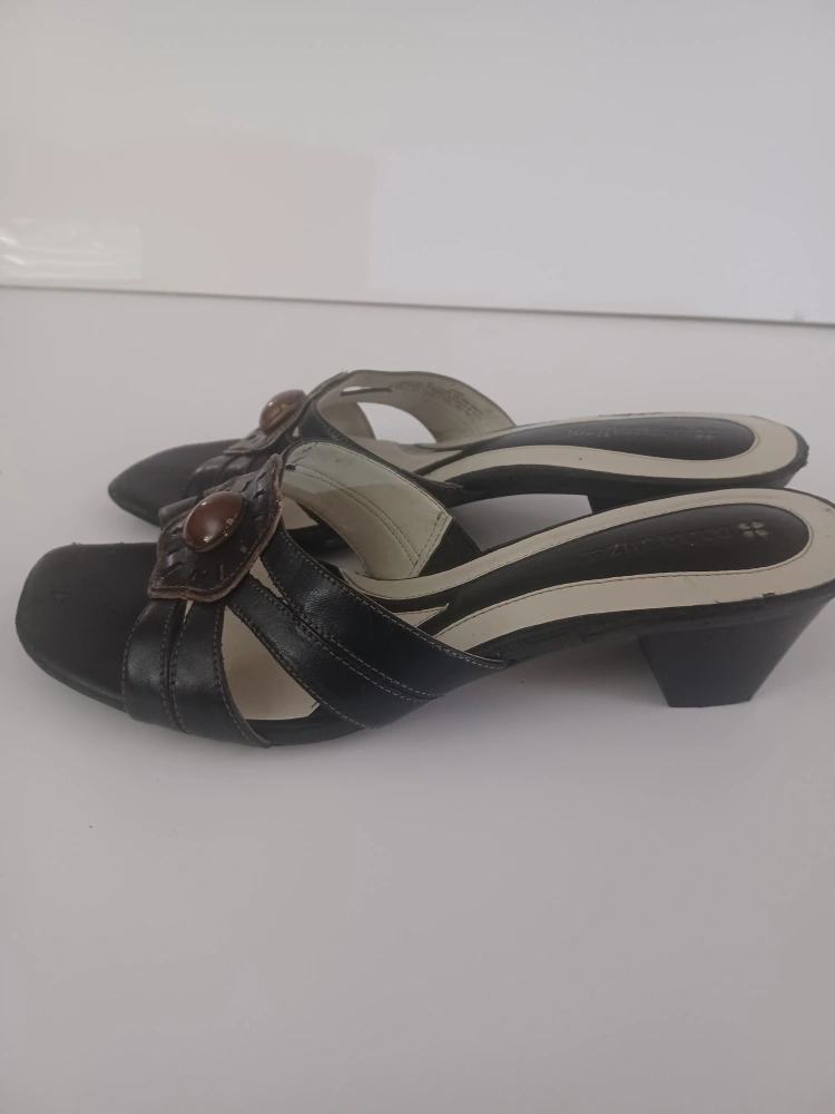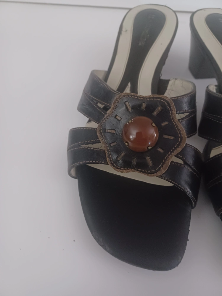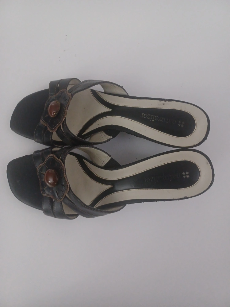 These Naturalizer heels are a stylish addition to any wardrobe! They feature a unique flower detail on the straps and are made of black leather. They're in good condition and are a women's size 8. Perfect for dressing up or down!
