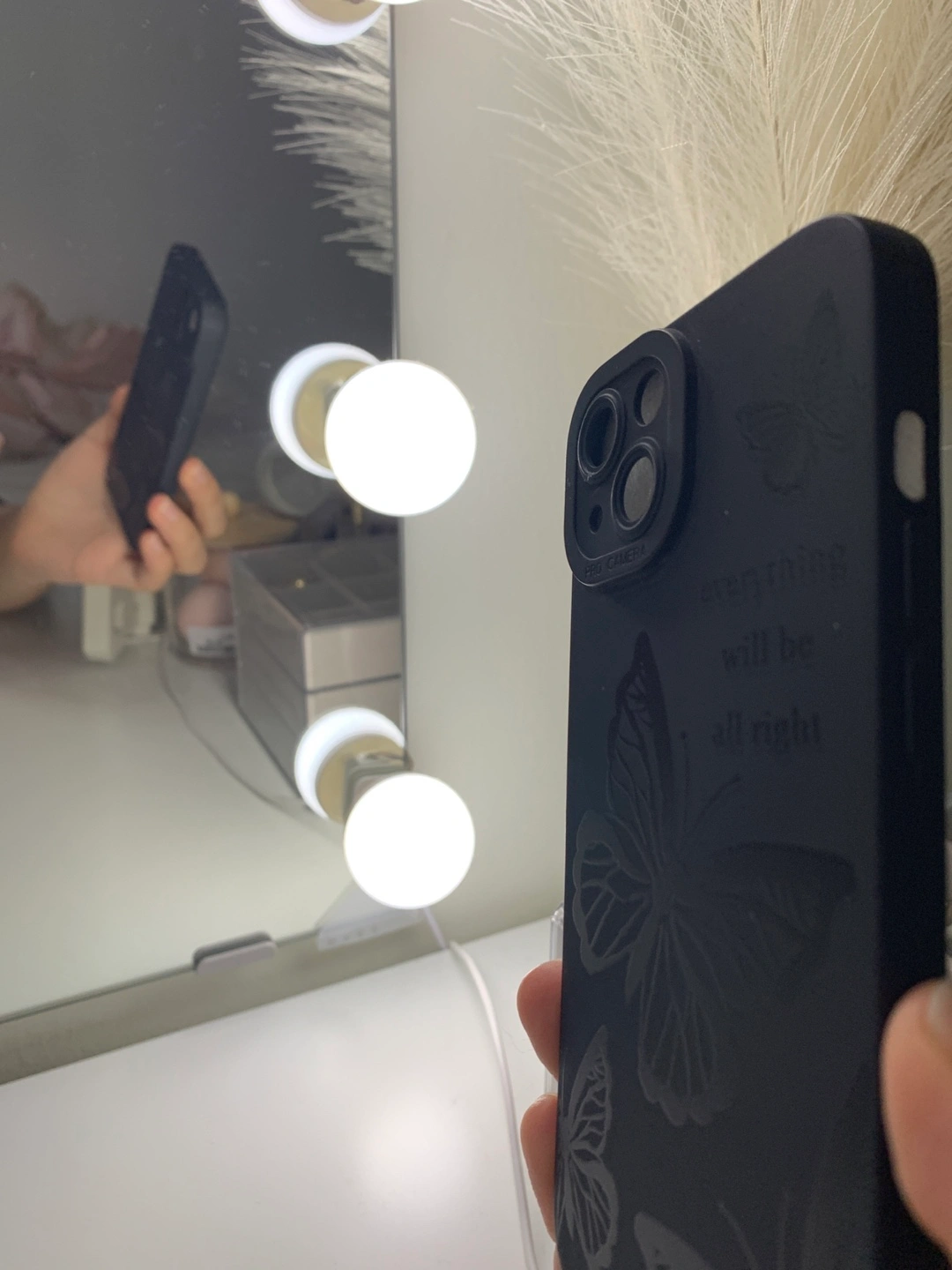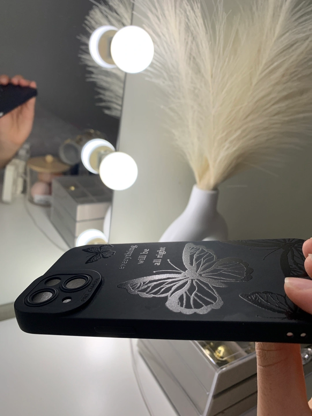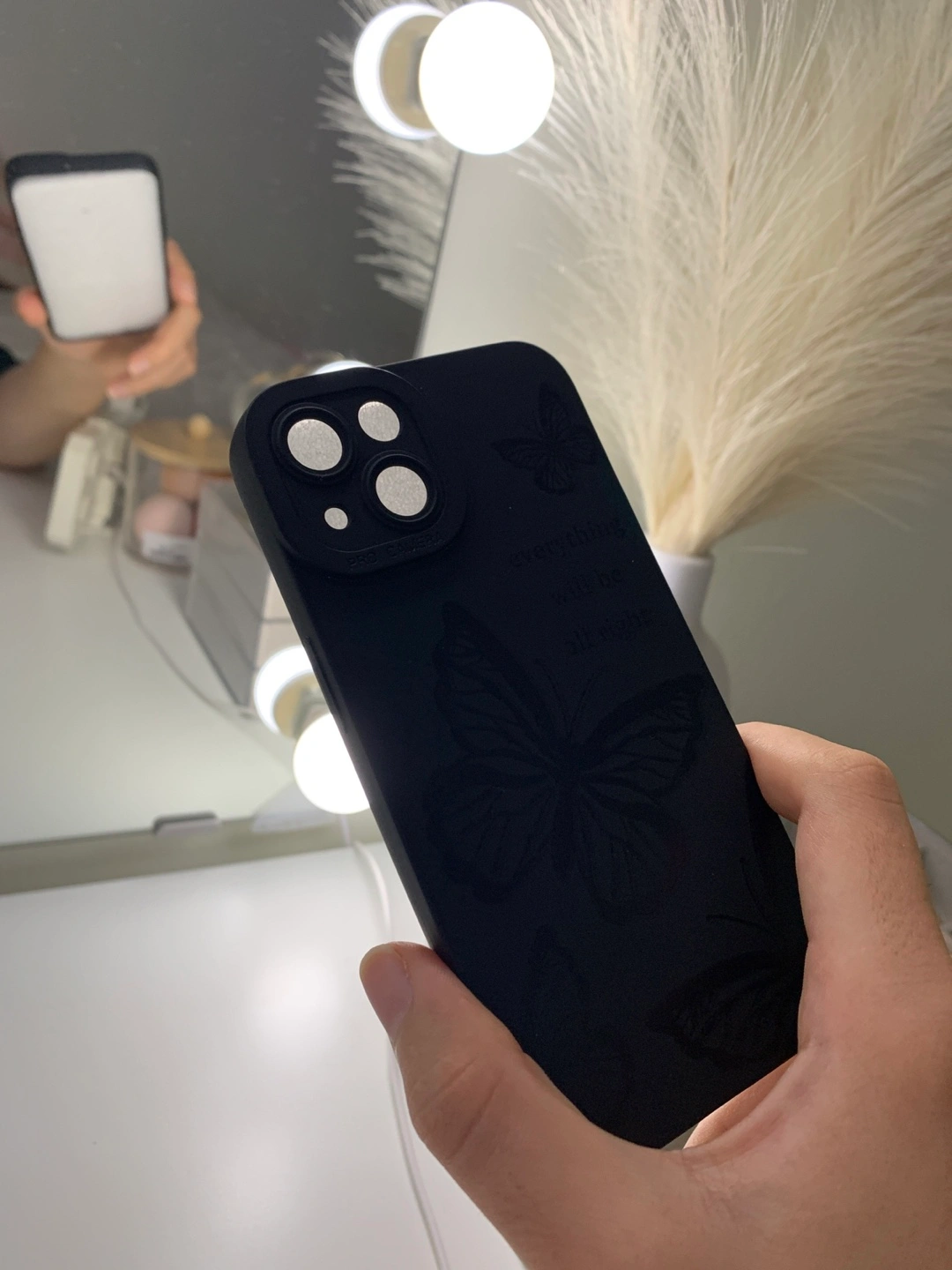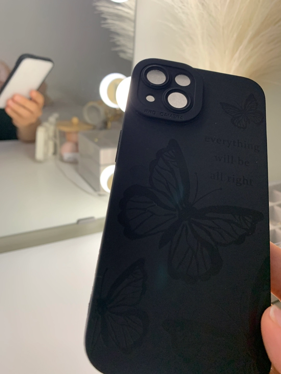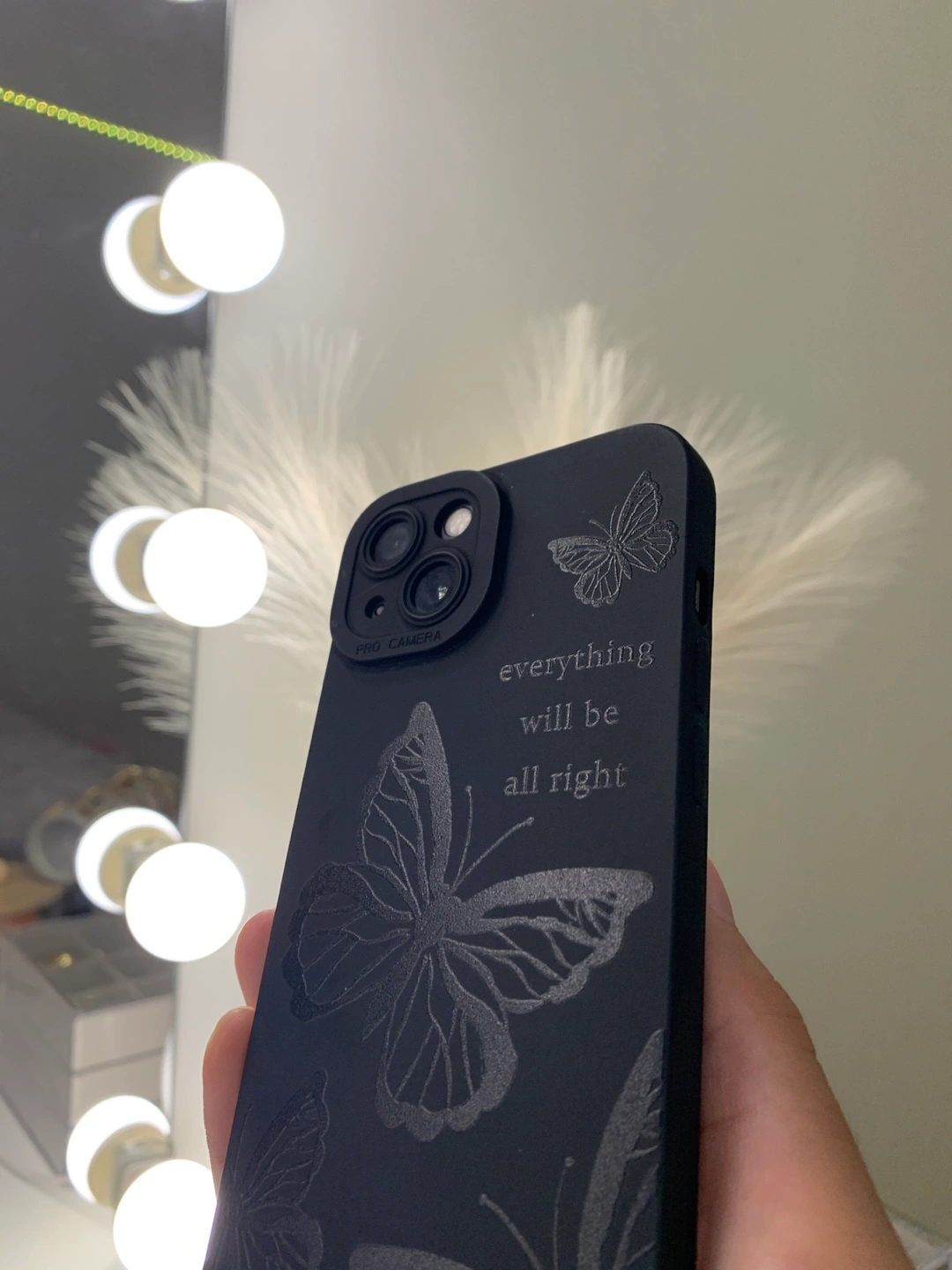 Selling a black iPhone case with a lovely butterfly design. It also says, "everything will be all right" on the side. It's in great condition and ready for a new phone!