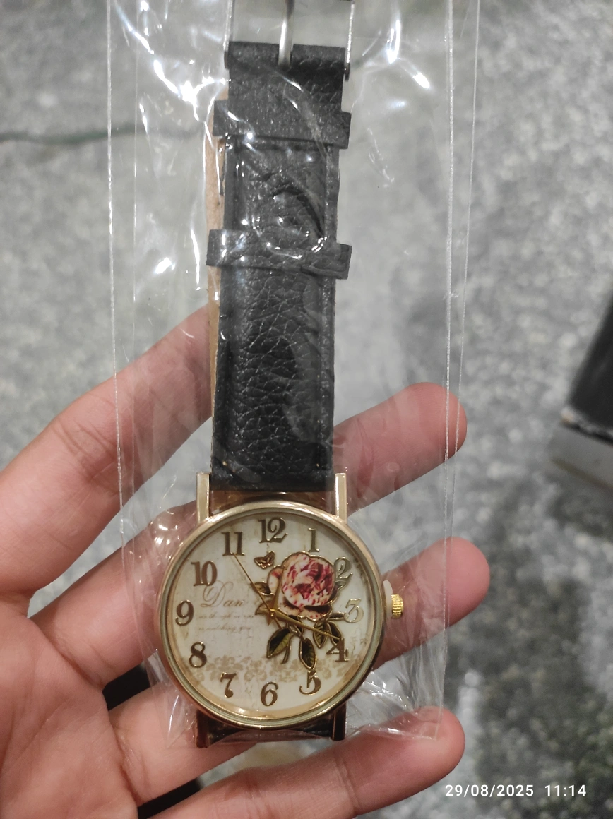 This is a Dan watch with a beautiful rose design on the face! It features a black leather strap and a gold-tone case. The watch is in great condition and ready to add a touch of elegance to your wrist