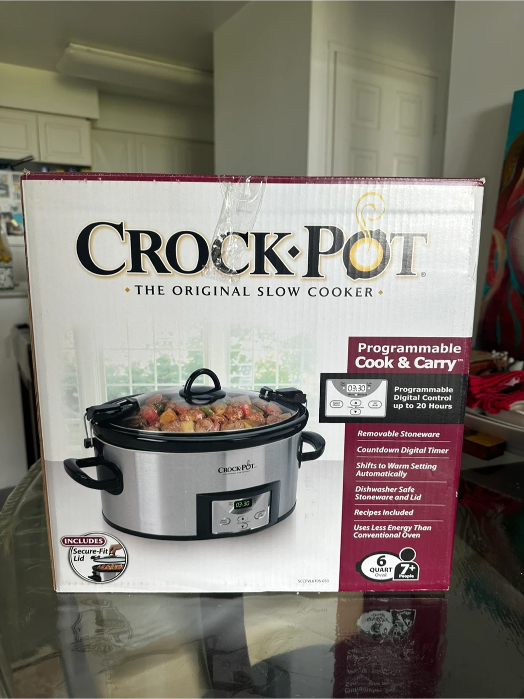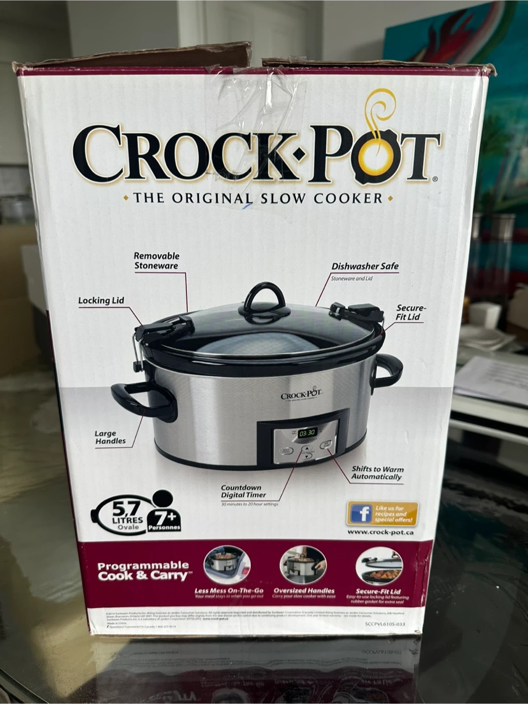 I'm selling a Crock-Pot Programmable Cook & Carry slow cooker! It's in great condition and comes with the original box. Key features: - Removable stoneware - Dishwasher safe stoneware and lid - Secure-fit lid - Large handles - Countdown digital timer (up to 20 hours) - Shifts to warm automatically It has a 5.7 litres capacity, perfect for 7+ people! It’s brand new/never used