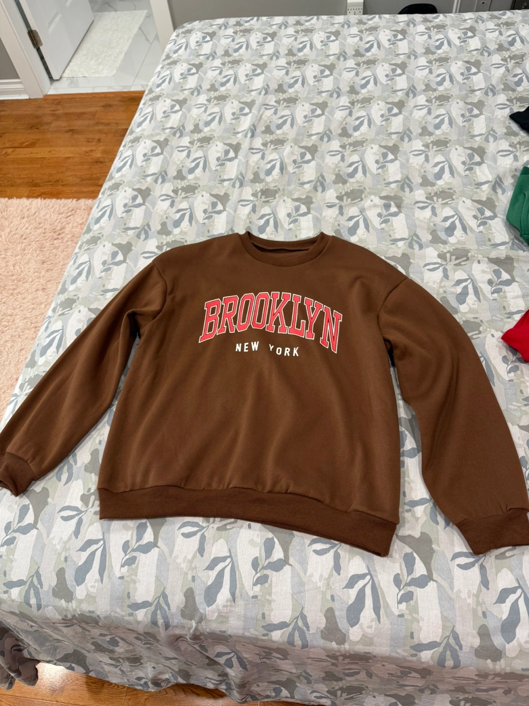 Selling a cozy brown sweatshirt with "BROOKLYN NEW YORK" in red lettering! It's super comfy and in great condition, perfect for those chilly Canadian evenings. Completely brand new never worn.