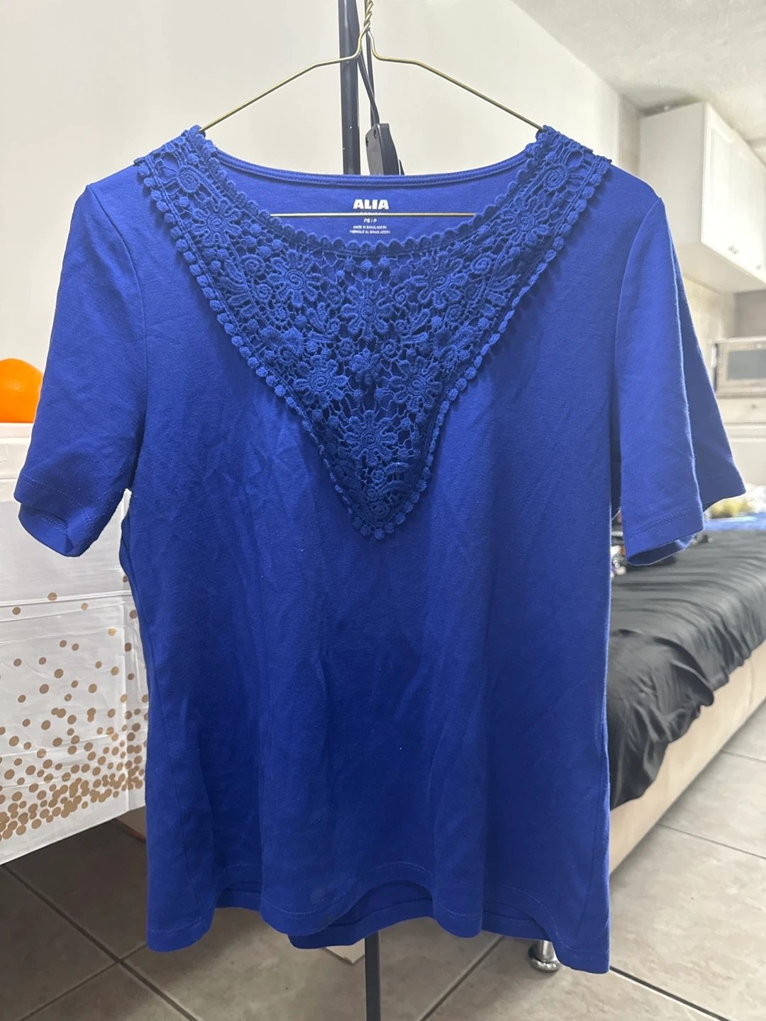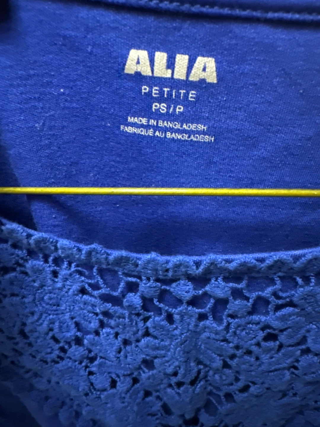 This is a lovely blue top from ALIA. It's a petite size PS/P. The top features a beautiful lace design around the neckline, adding a touch of elegance to a casual style. Perfect for everyday wear!