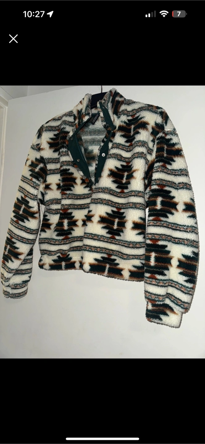Cozy H&M fleece pullover with a unique pattern! It's in great condition and perfect for staying warm on chilly days. The fleece material is soft and comfy, and the button-up design adds a touch of style. Size is not indicated, please refer to the photos