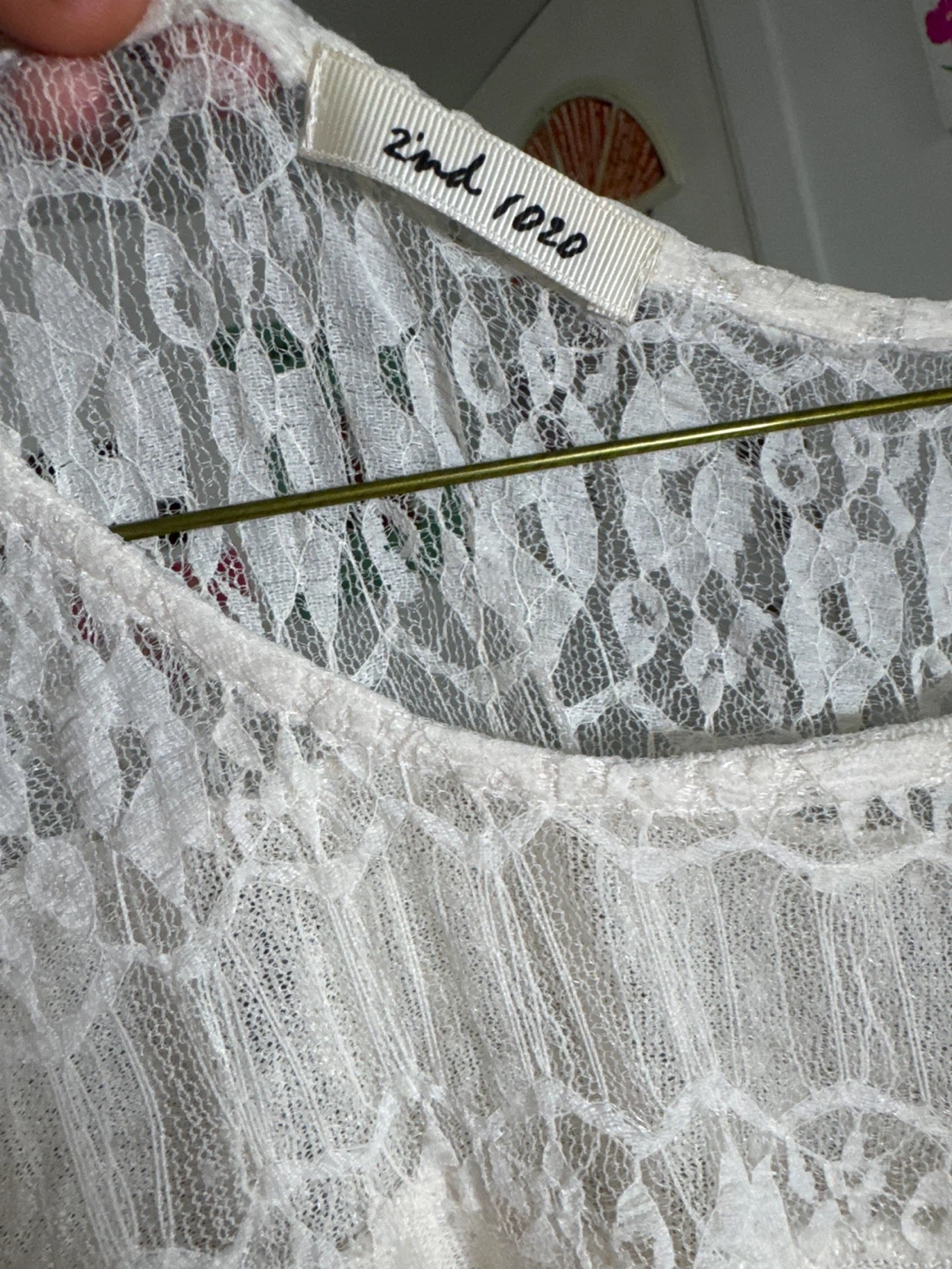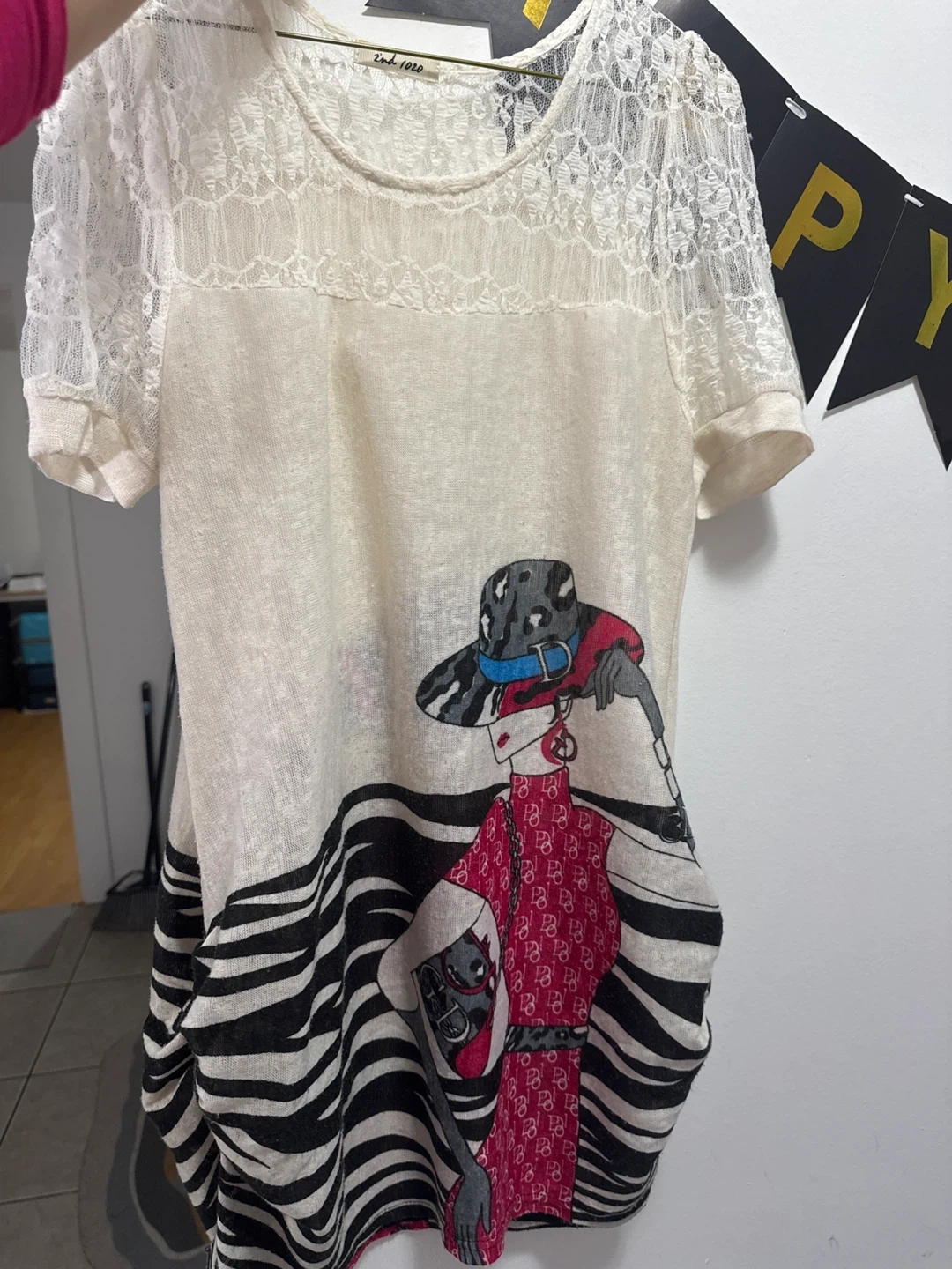 Here's a 2nd 1020 tunic top featuring a unique design with lace detailing and a graphic print. The material is lightweight and comfortable, perfect for everyday wear. It's in great condition and ready for a new home