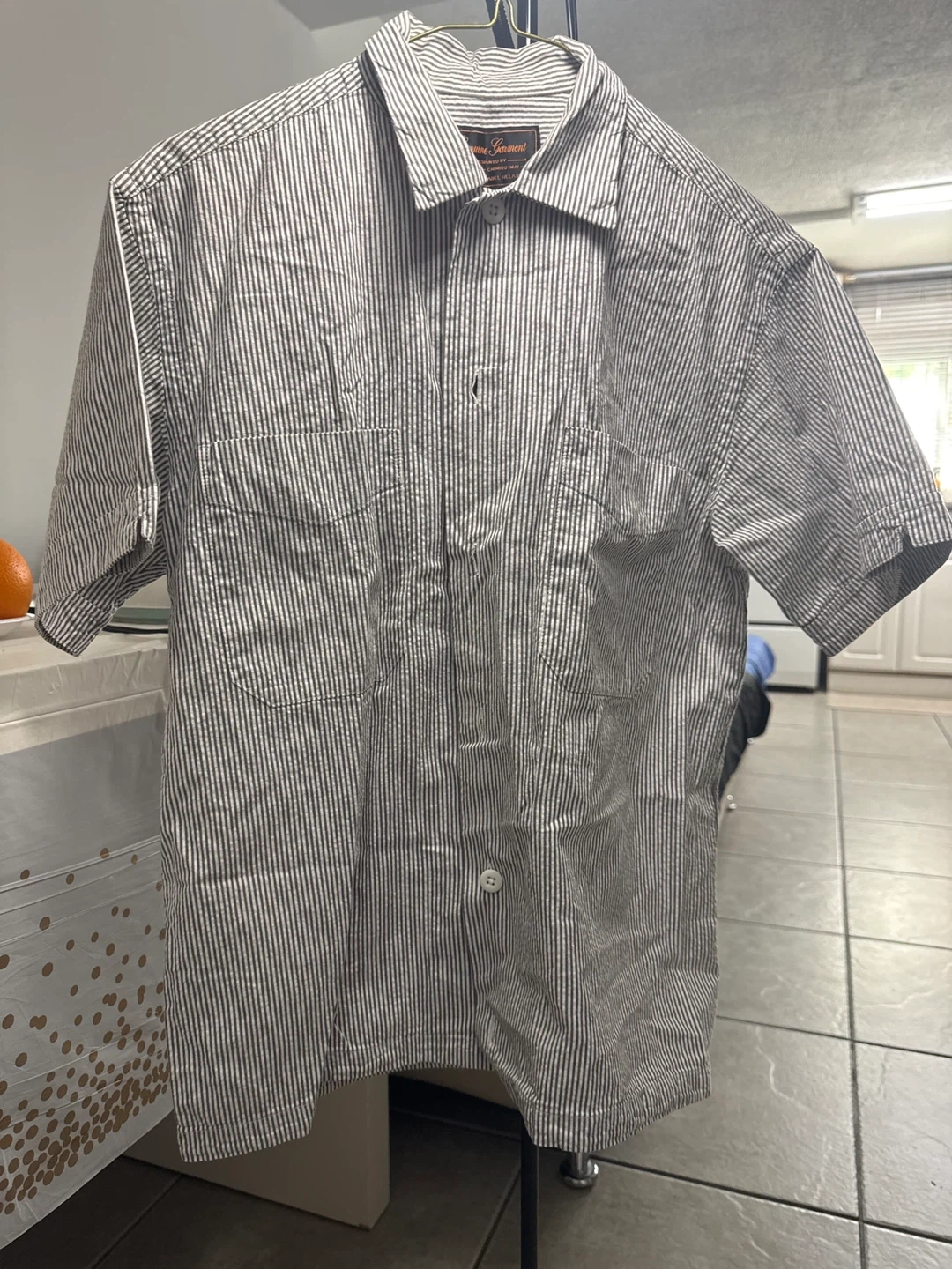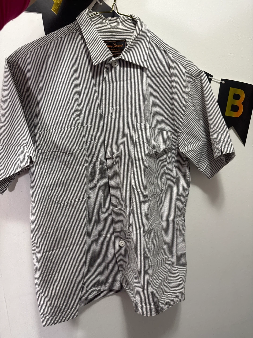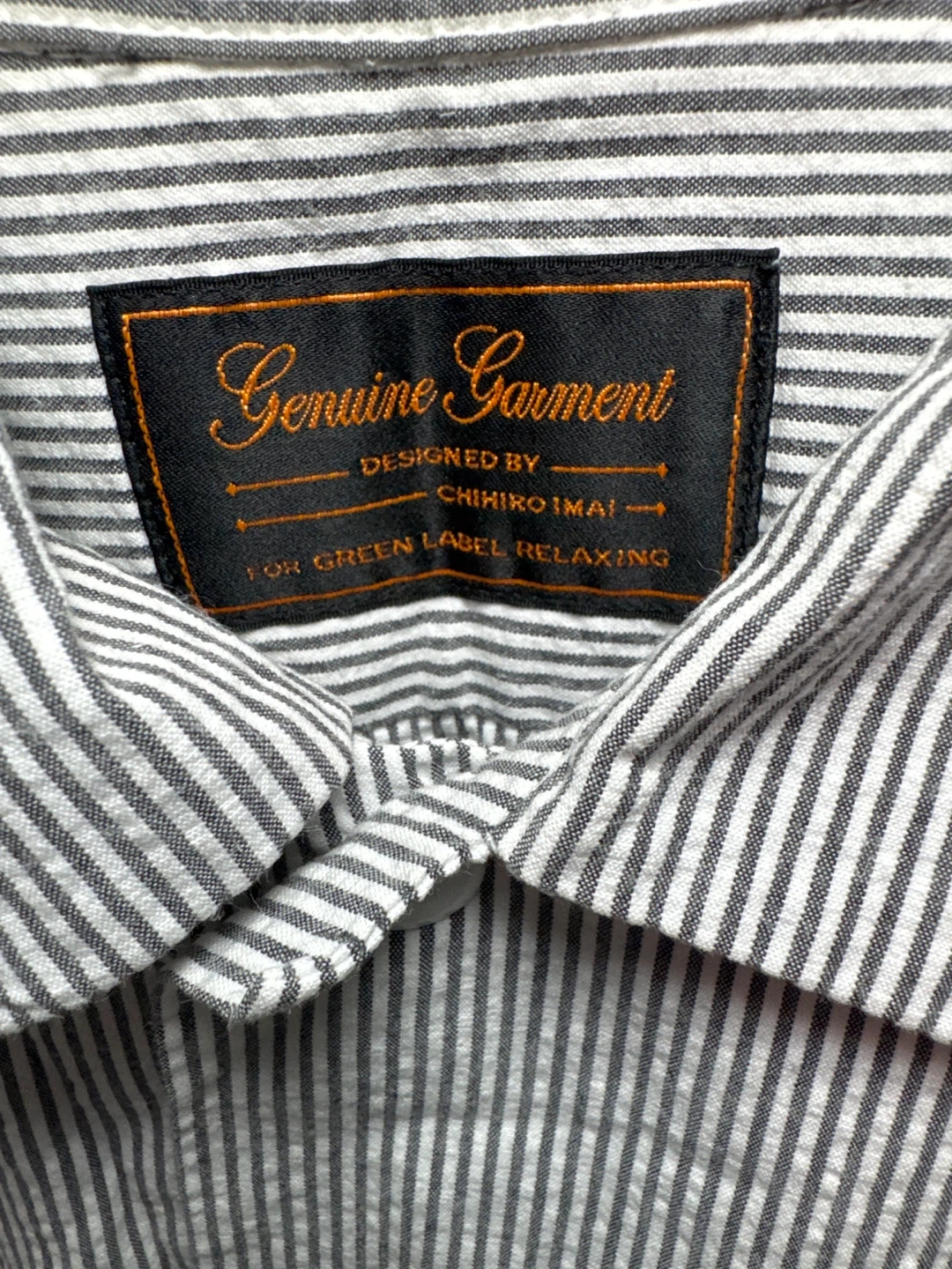 Here's a gently used striped shirt from Genuine Garment, designed by Chihiro Imai for Green Label Relaxing! It features a classic striped pattern and is perfect for a relaxed, casual look