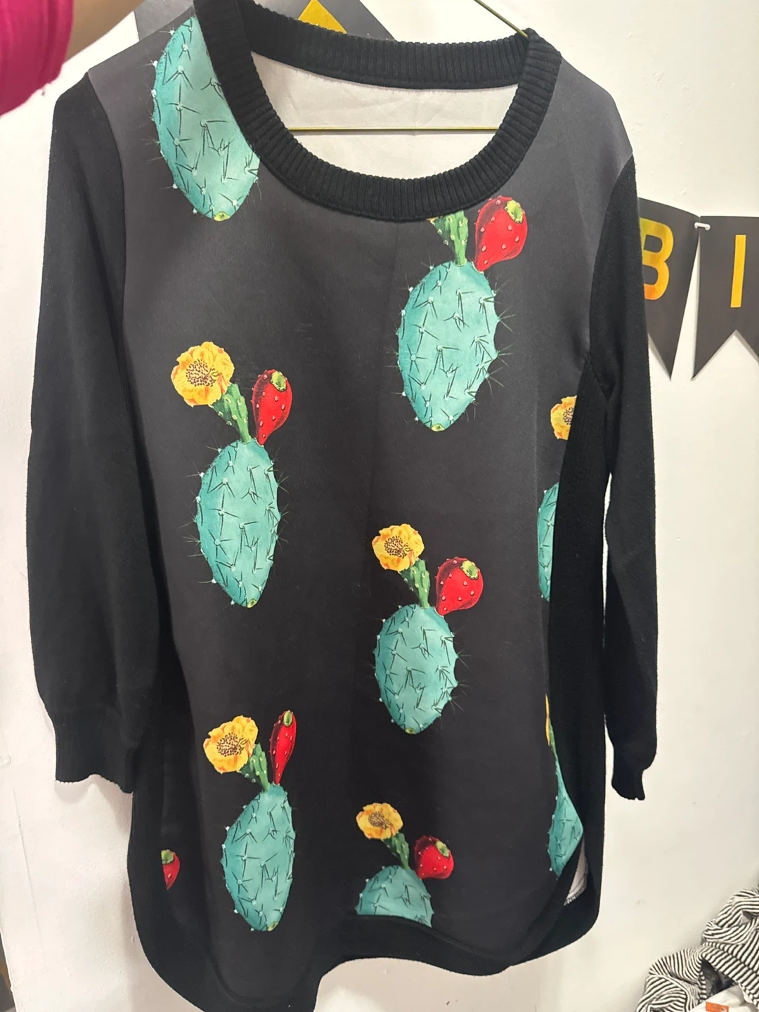 Cute dress with a fun cactus print! The sweater is black with vibrant cactus and flower designs. It's in great condition and ready for a new home