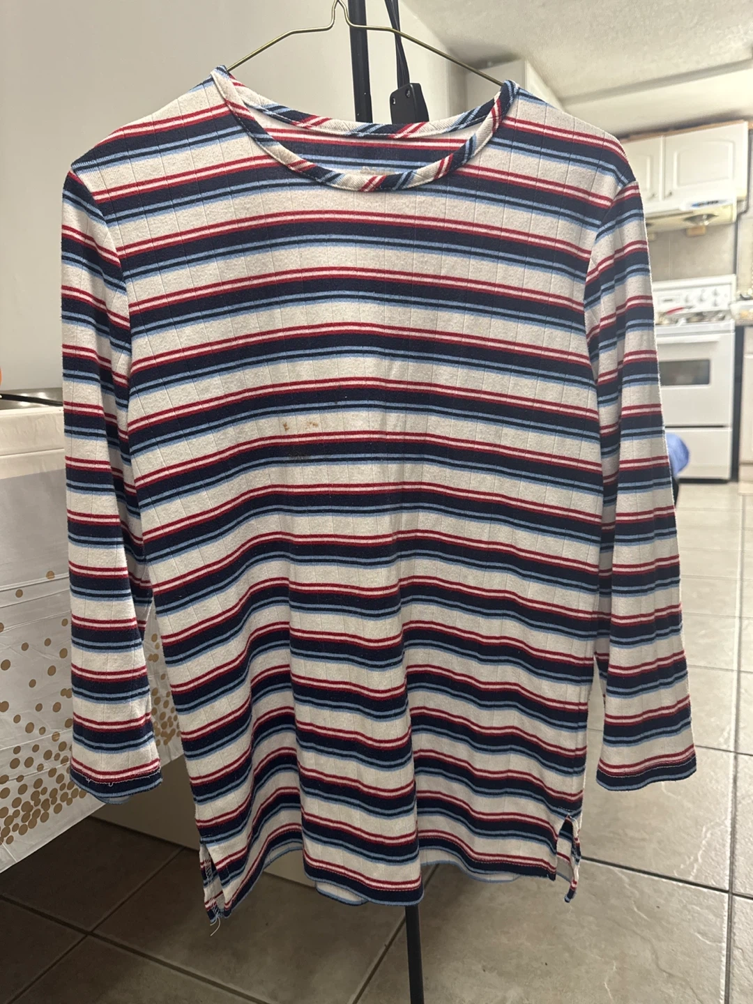 Here's a long sleeve top with a striped pattern. It features red, white, and blue stripes.