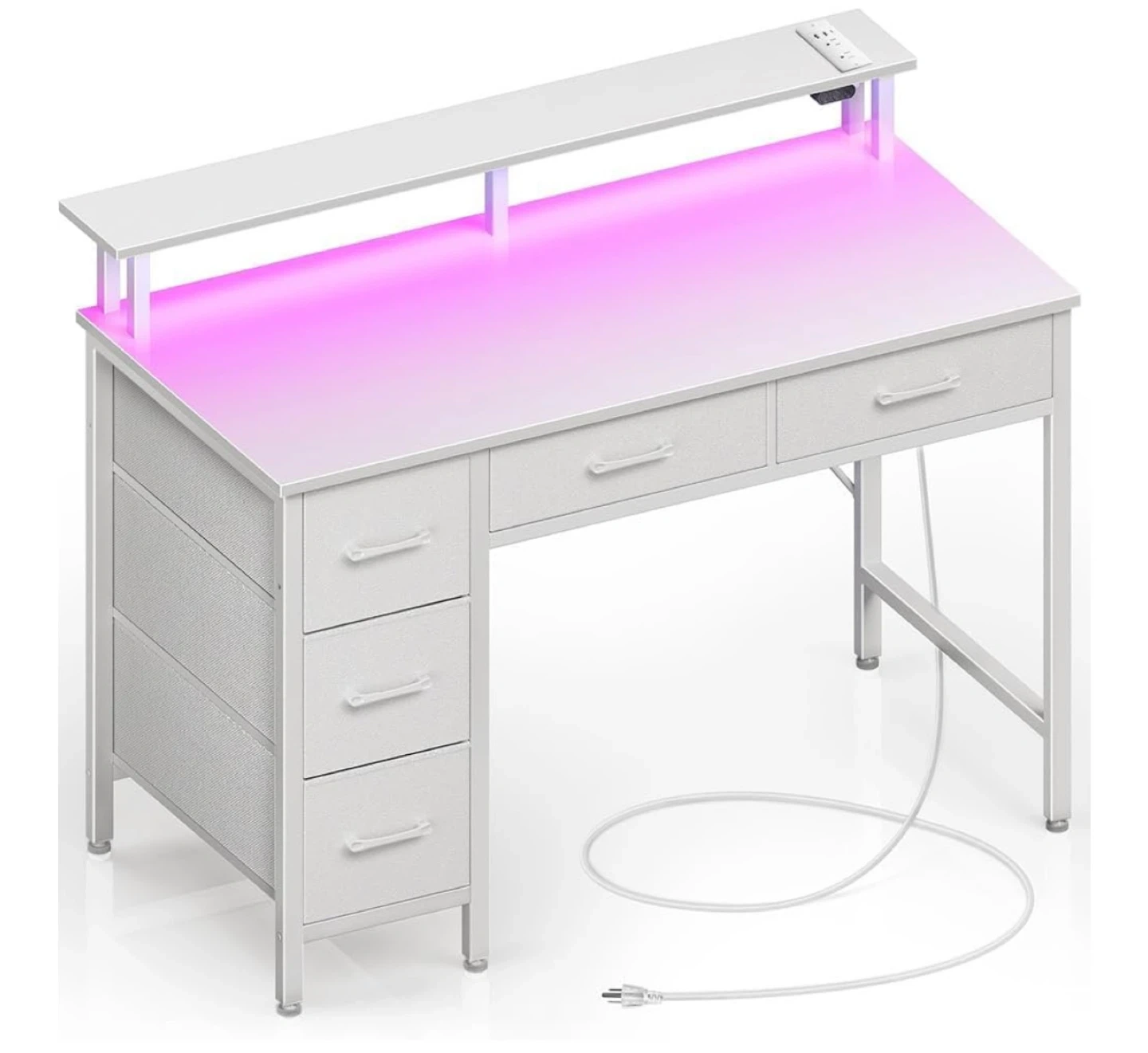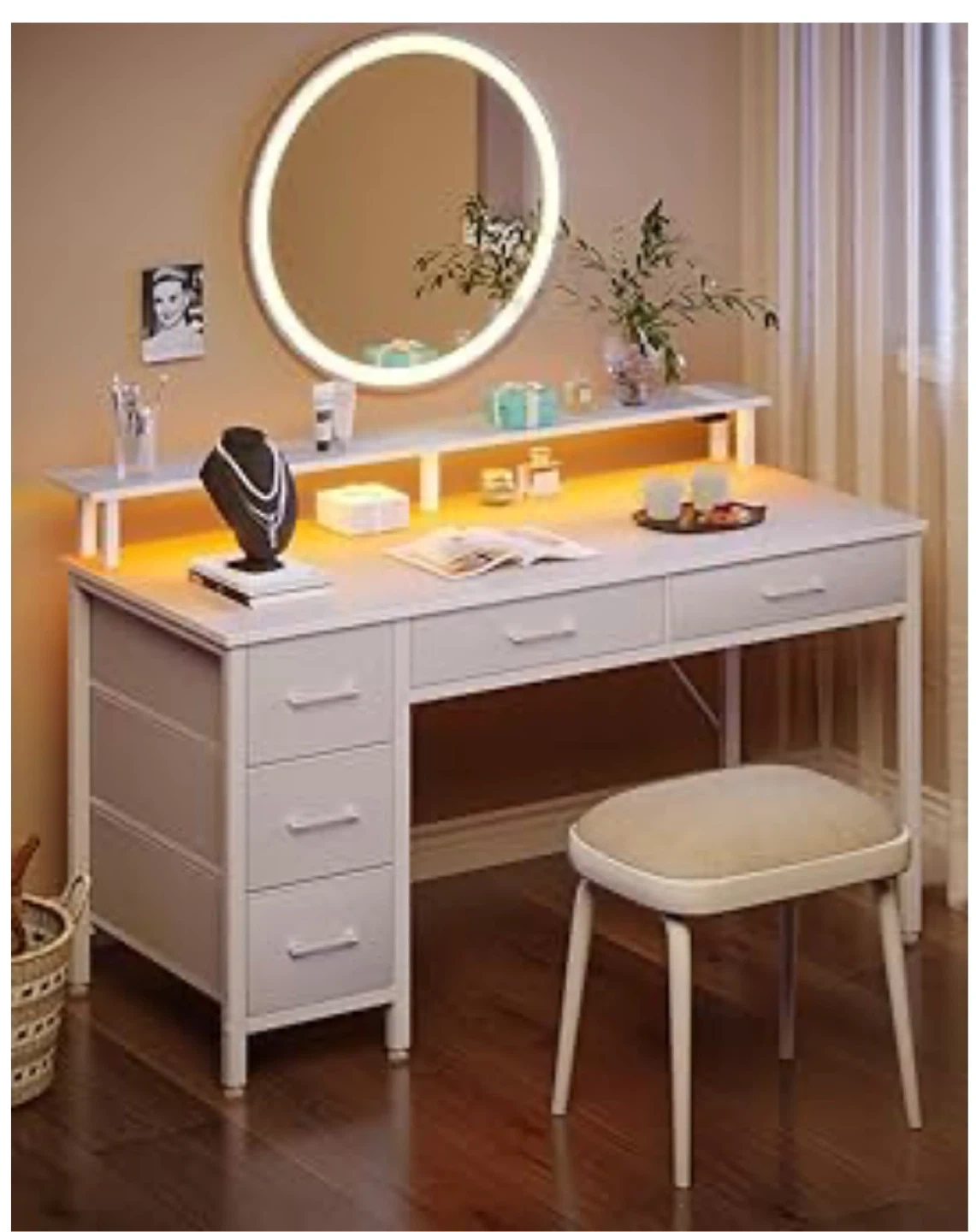 Looking to sell this lovely white desk! It look features drawers for storage and a built-in LED light for extra ambiance. It would be perfect for a home office or vanity setup. The desk also features AC Outlets, USB Ports and a Type-C port!