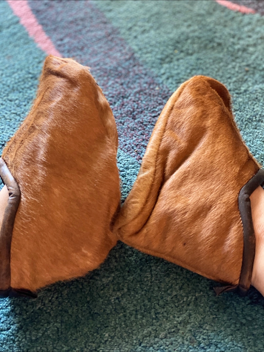 These are a pair of cozy brown furry slippers. They appear to be in good condition and ready to keep your feet warm!