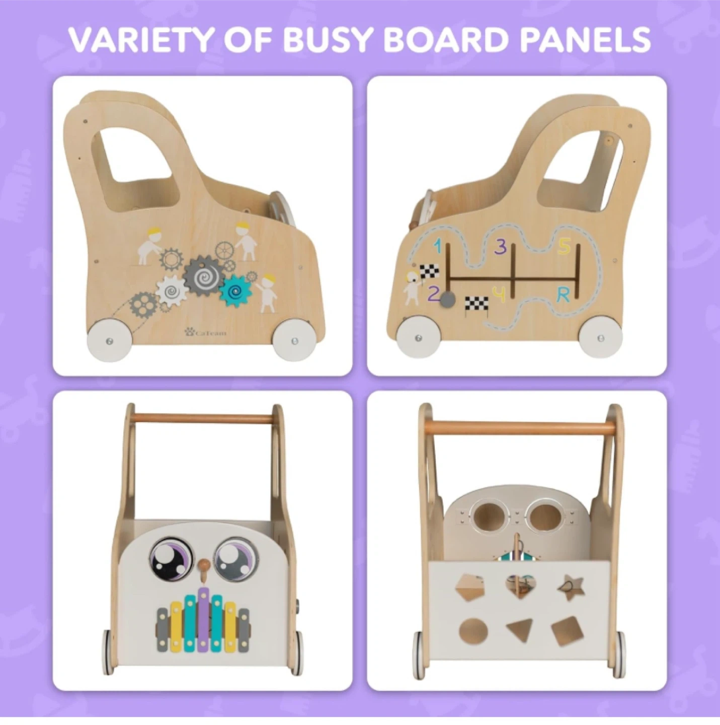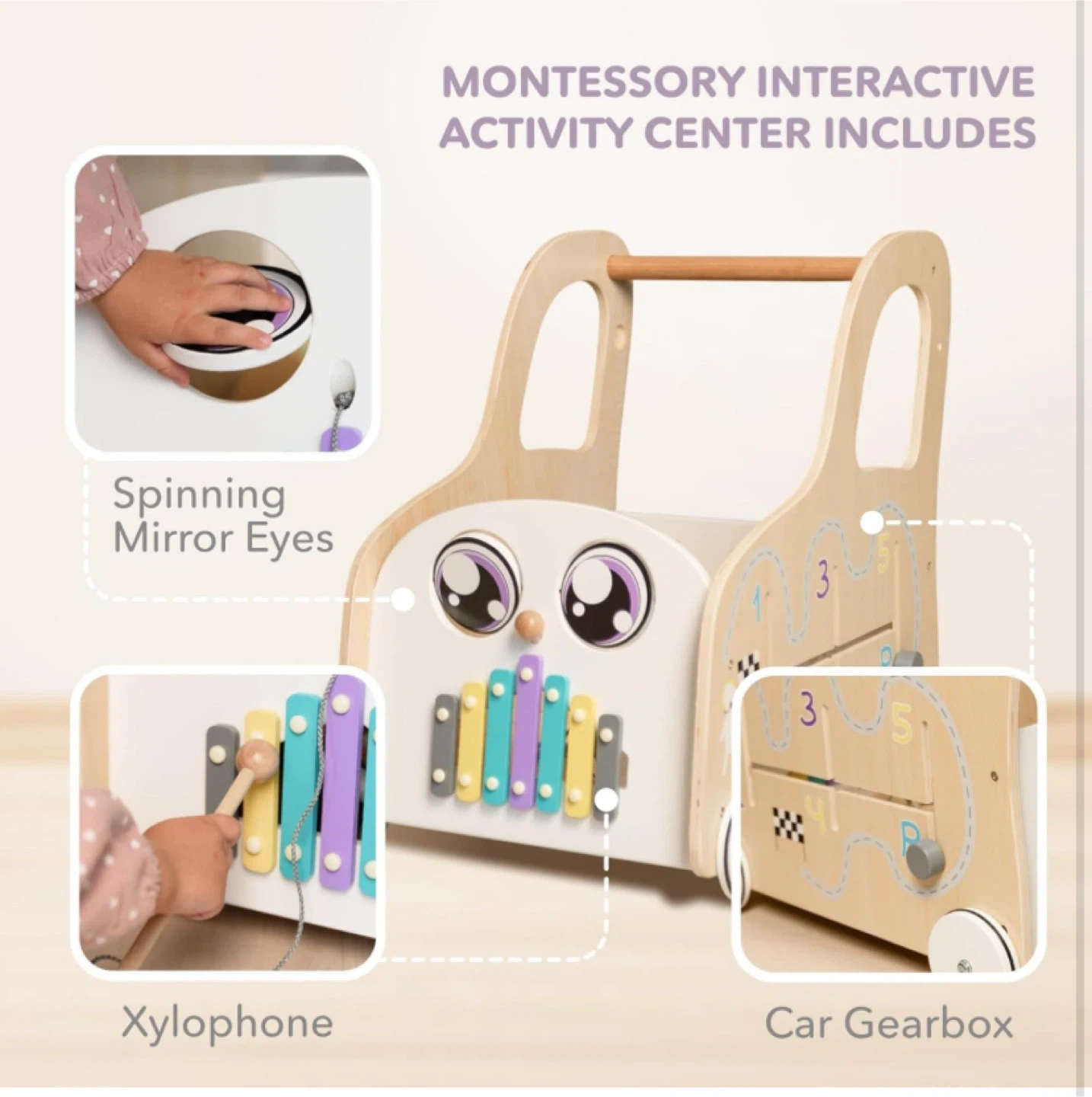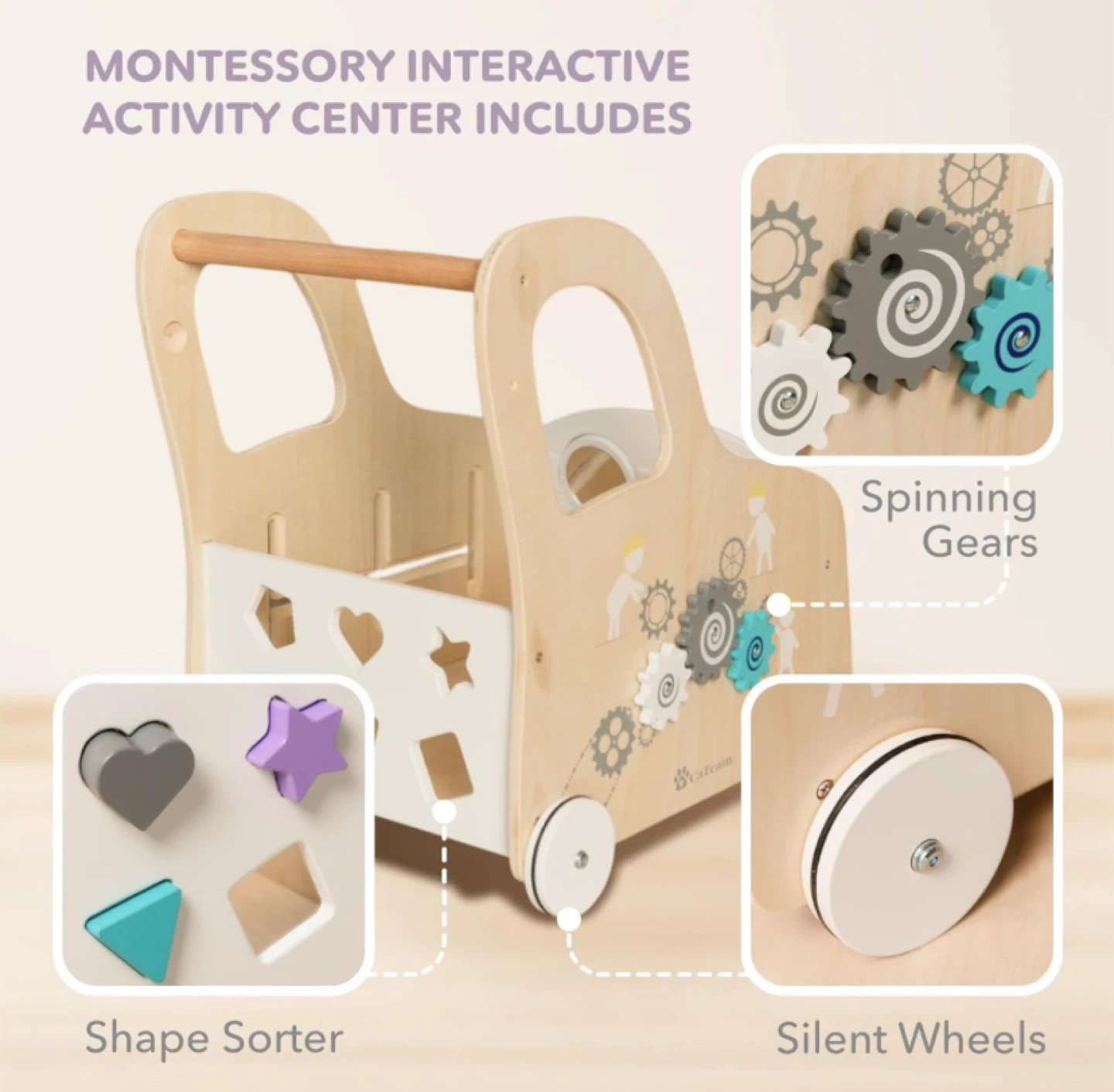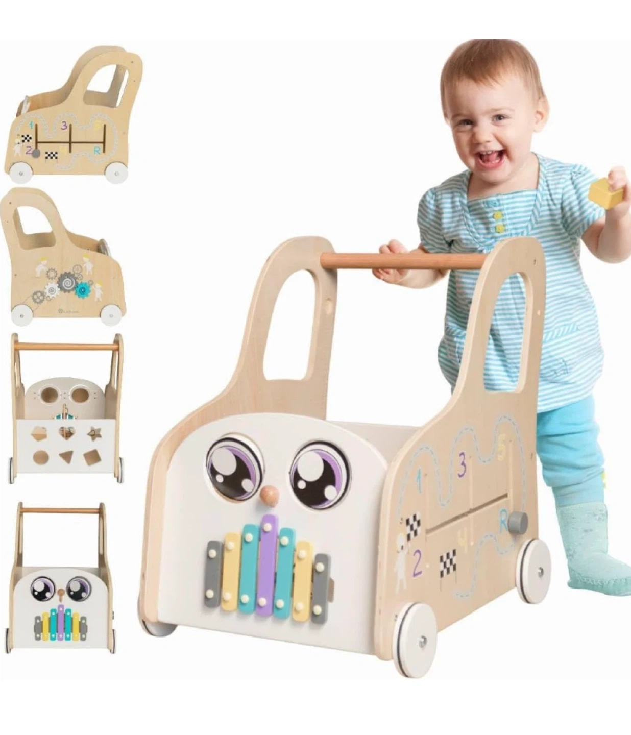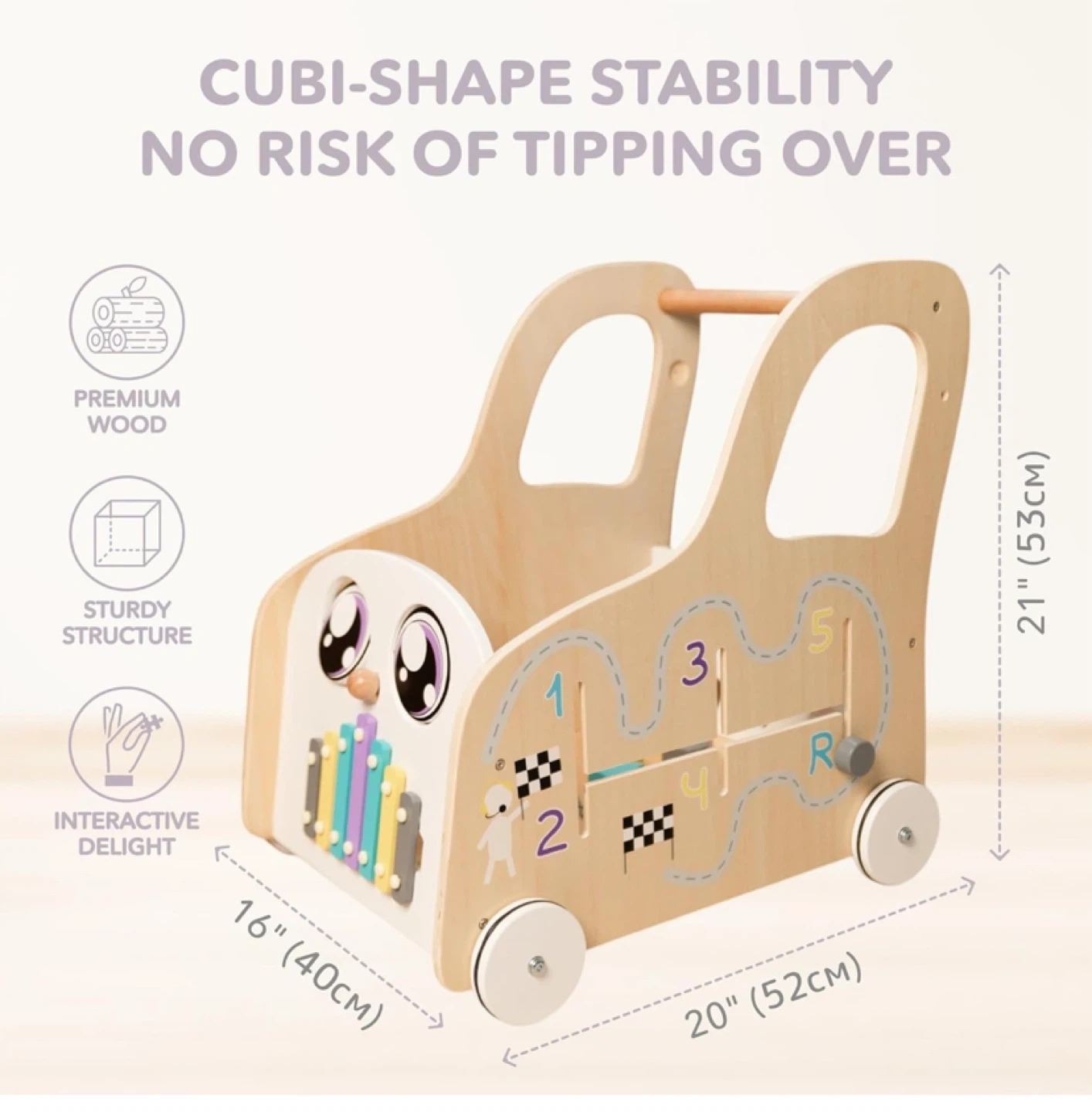 This CalfCam baby walker is a Montessori-style interactive activity centre! It's made from premium wood and has a sturdy structure to prevent tipping. It features spinning mirror eyes, a xylophone, a car gearbox, spinning gears, a shape sorter, and silent wheels. Dimensions are approximately 21" (53cm) high, 16" (40cm) wide, and 20" (52cm) deep, providing cubi-shape stability and interactive delight for your little one