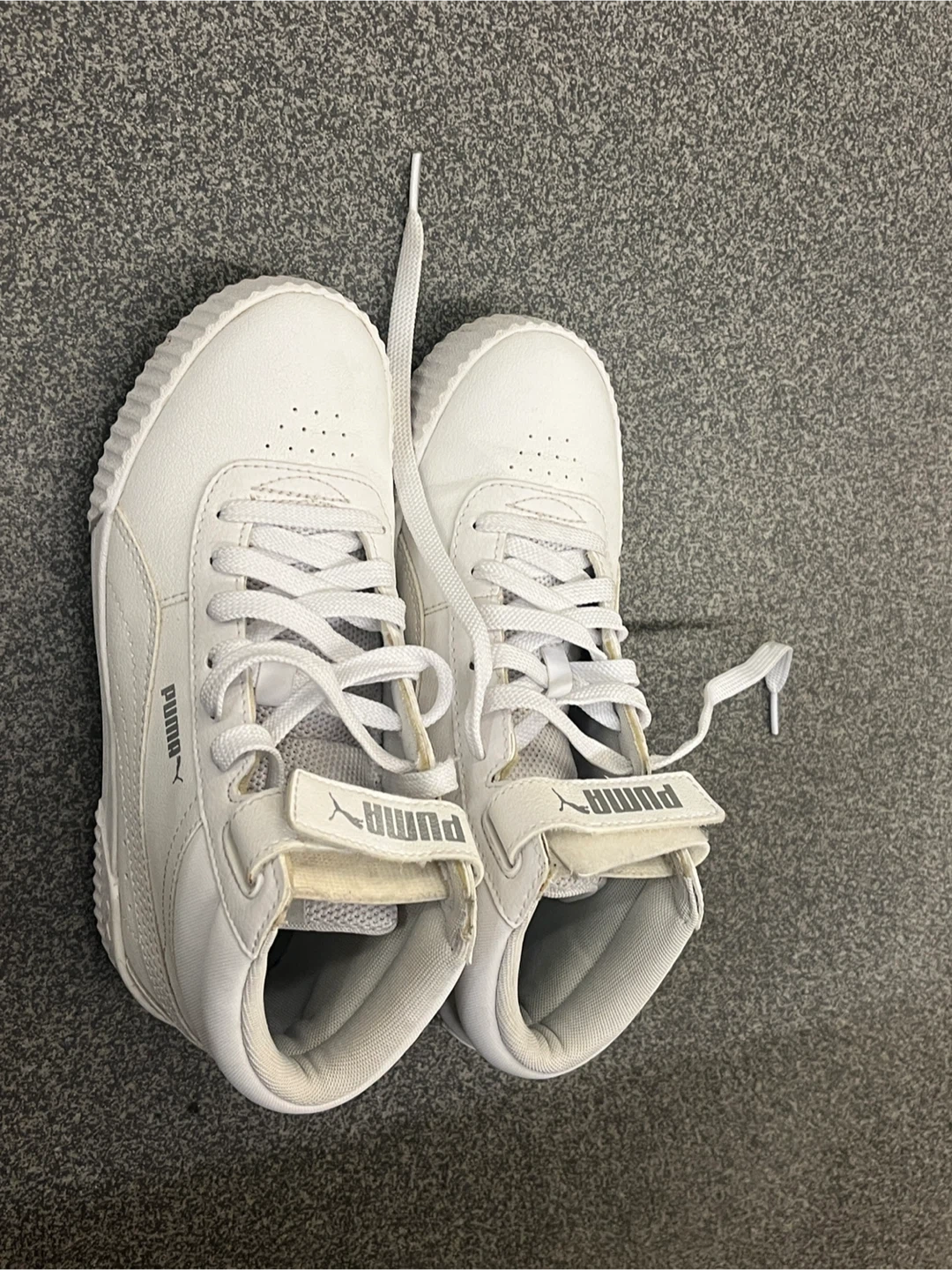 These Puma Caina V sneakers are in white and feature the classic Puma logo on the side and strap! They are in great condition and ready for a new home Size 5