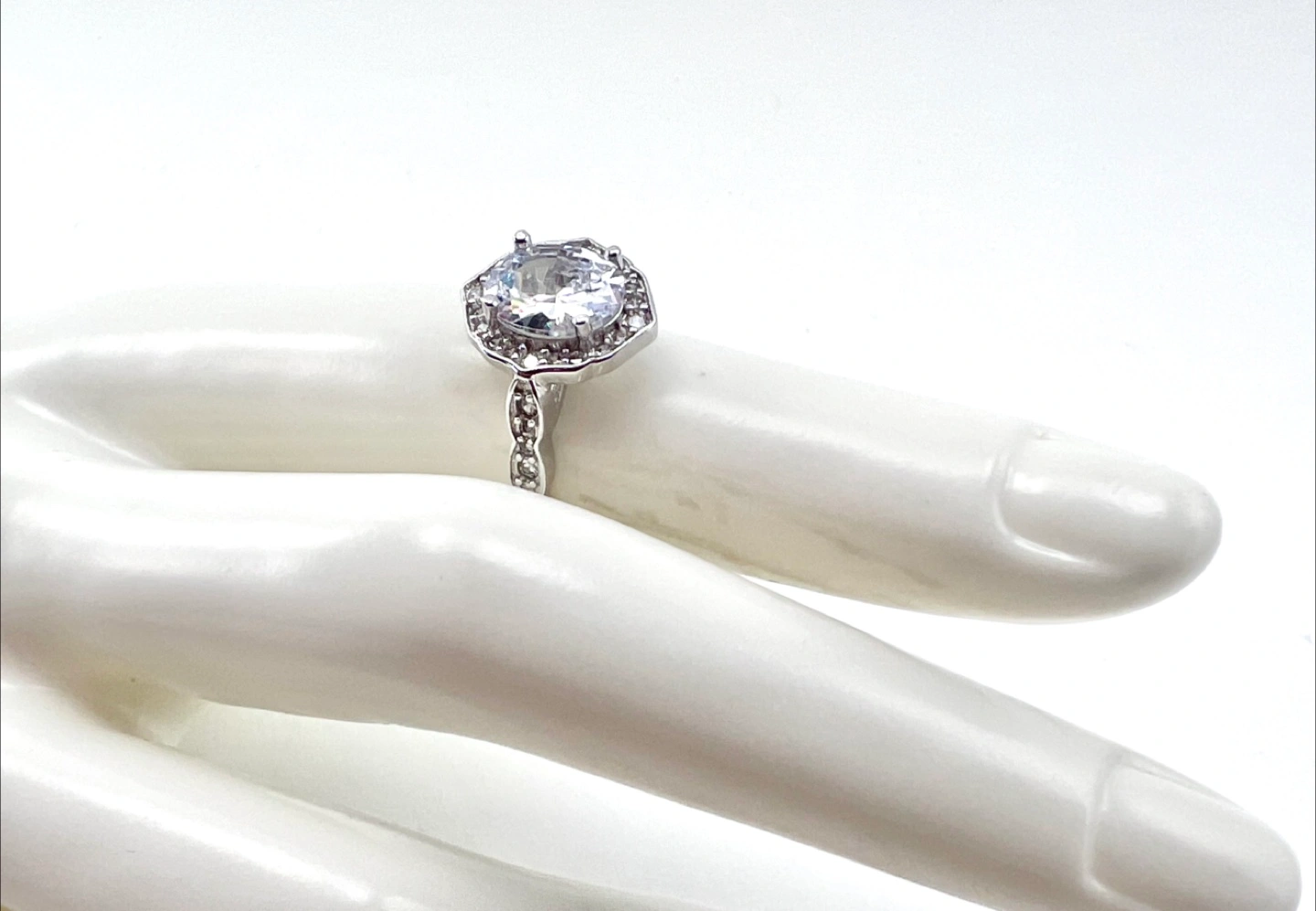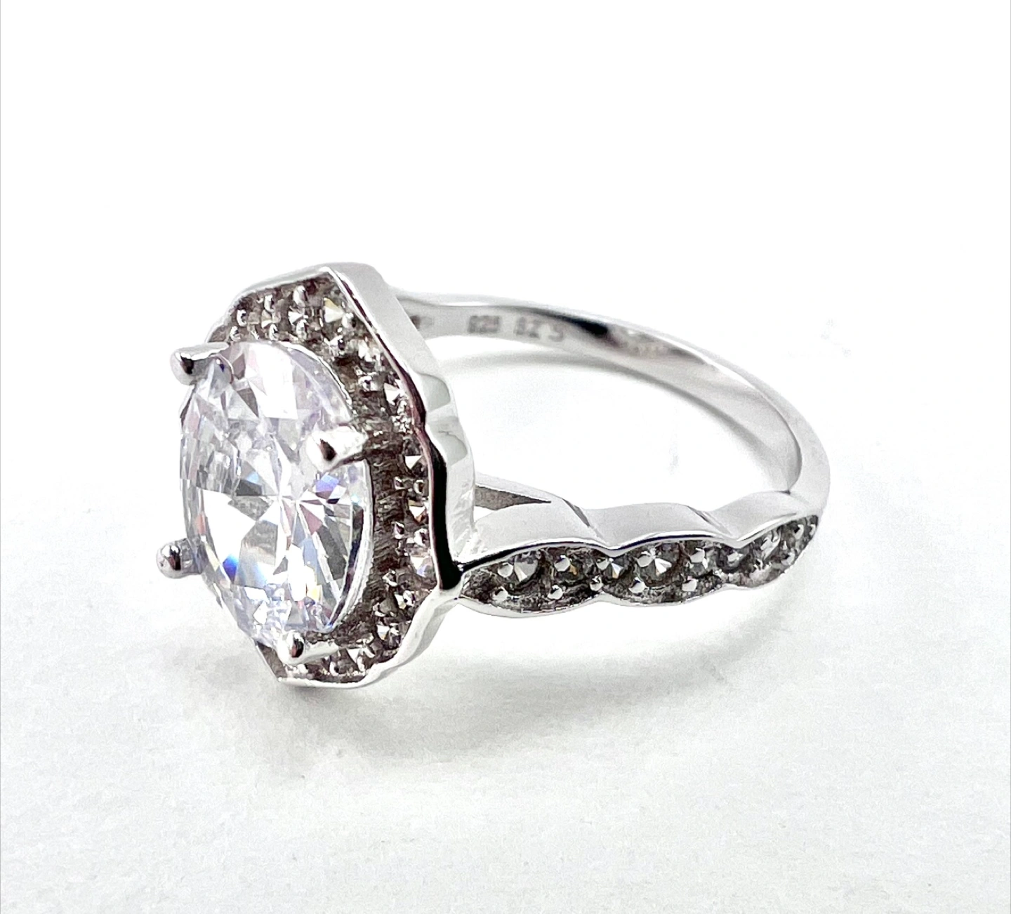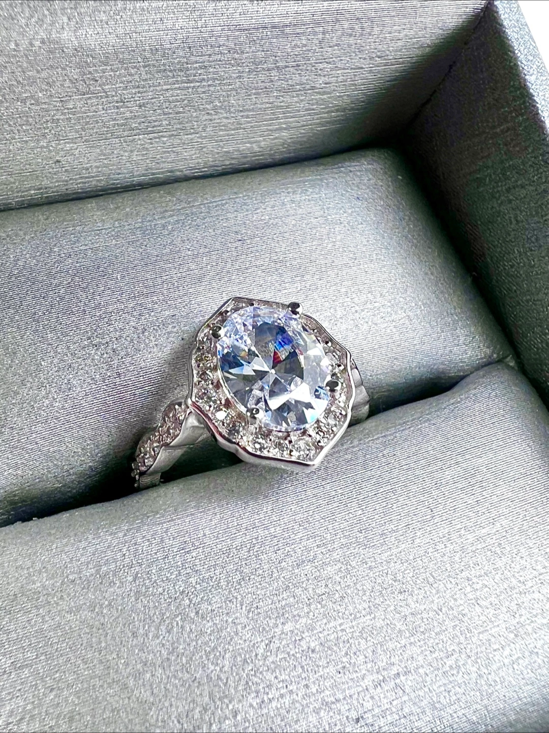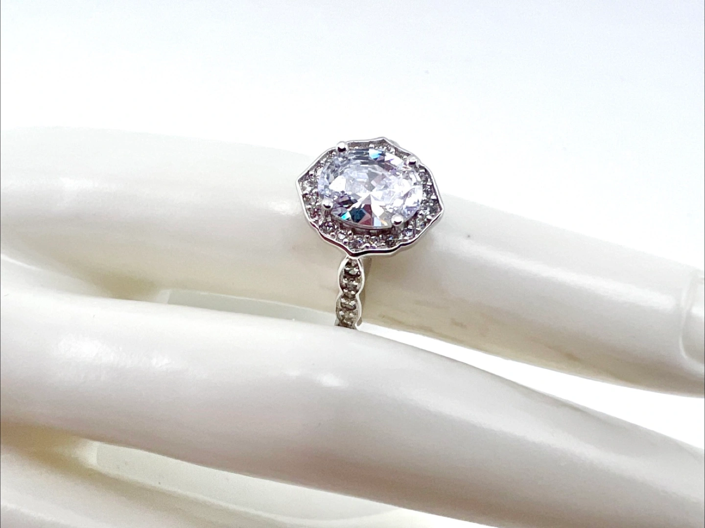 Sterling silver large oval white zirconia engagement style ring. Stamped 925 (sterling) size 5. Middle stone is surrounded by brilliant small white zirconias. No tarnishing or scratches — like-new & comes with presentation box Meetup Options: 1. Avenue Rd & St Clair Ave (public lobby or driveway of condo) or 2. Outside St Clair/Yonge subway station Sorry, no deliveries, other meetup spots or holds (will only hold during travel time for a confirmed pickup)