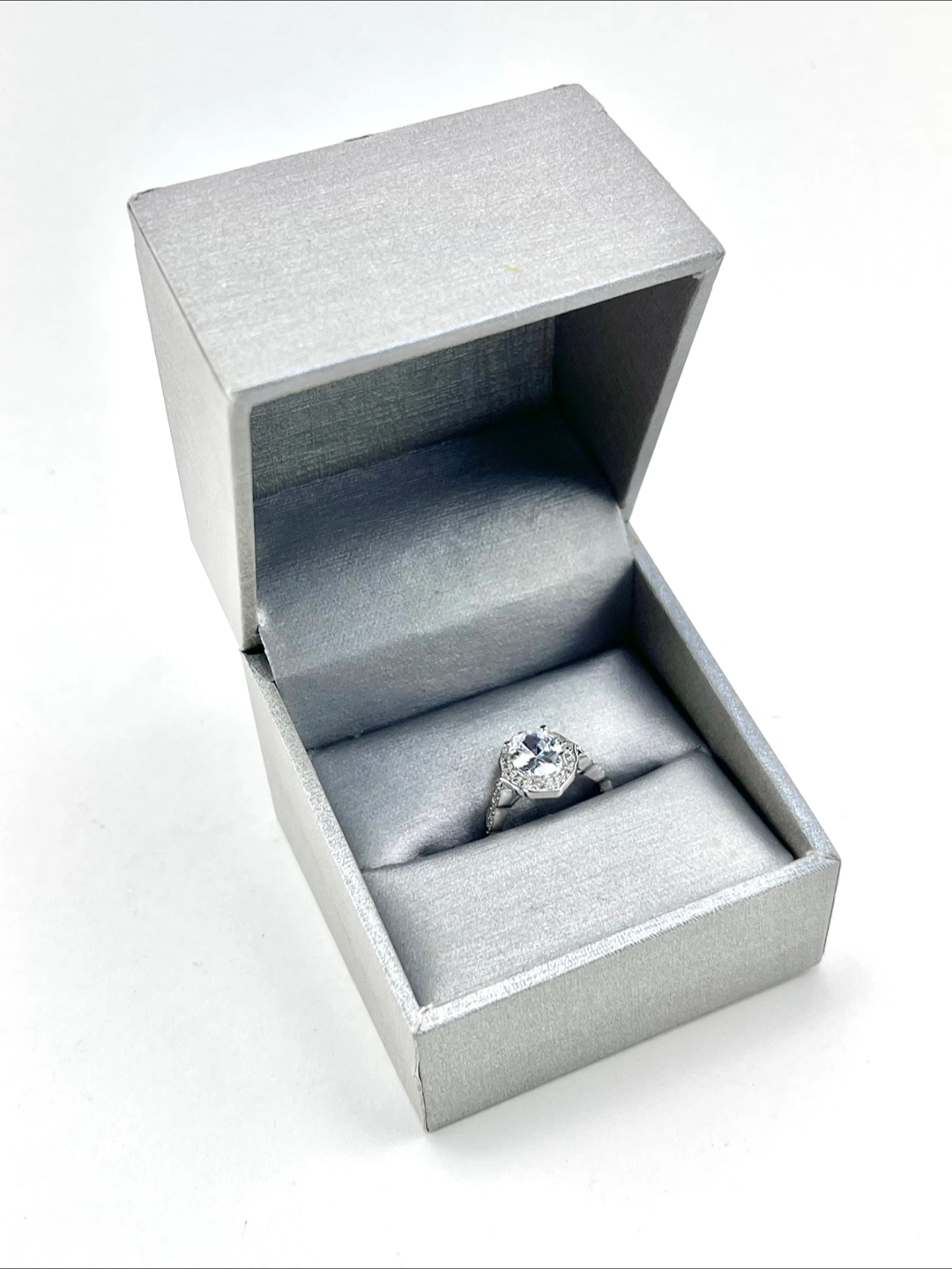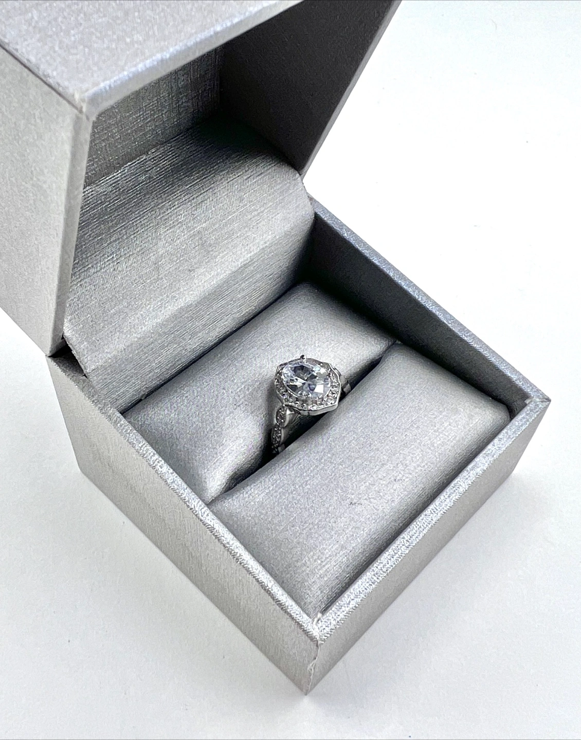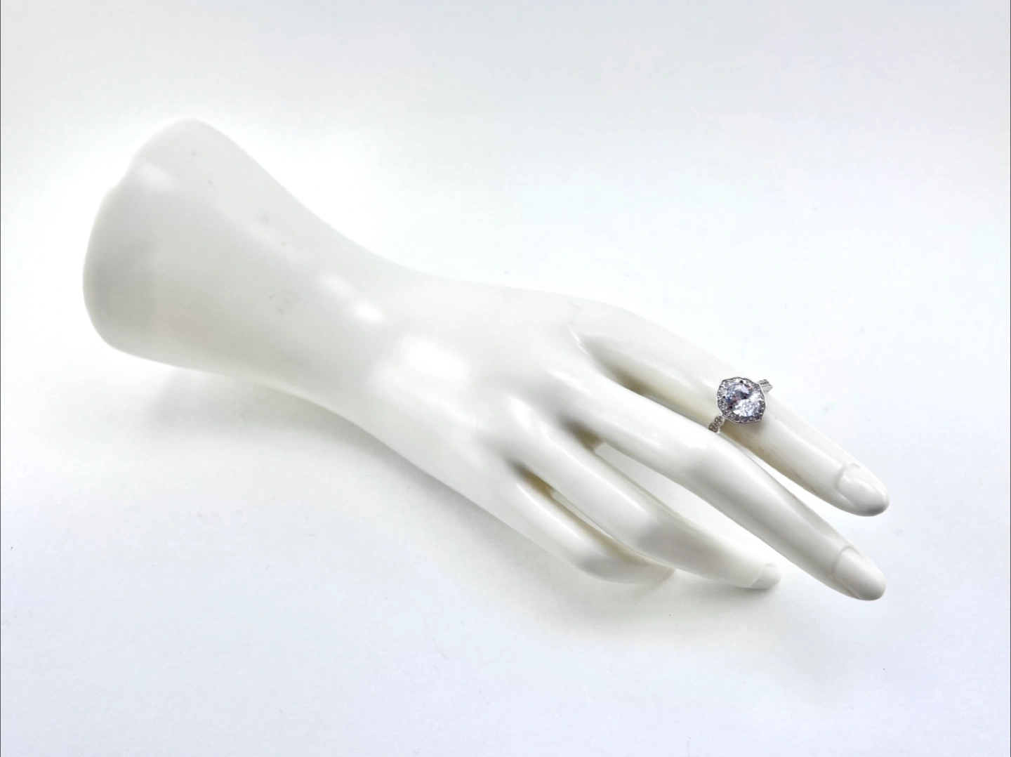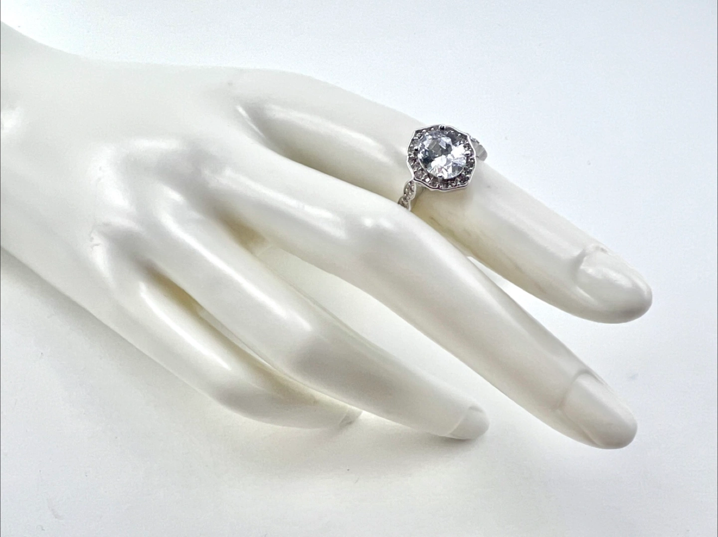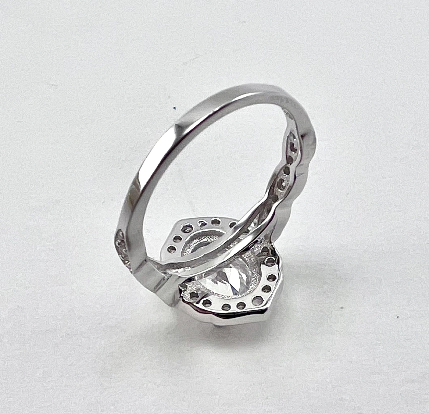 Sterling silver large oval white zirconia engagement style ring. Stamped 925 (sterling) size 5. Middle stone is surrounded by brilliant small white zirconias. No tarnishing or scratches — like-new & comes with presentation box Meetup Options: 1. Avenue Rd & St Clair Ave (public lobby or driveway of condo) or 2. Outside St Clair/Yonge subway station Sorry, no deliveries, other meetup spots or holds (will only hold during travel time for a confirmed pickup)