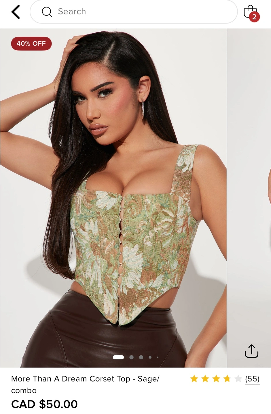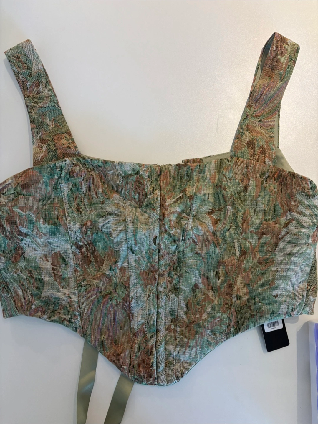 Selling a Fashion Nova corset top in a sage green combo! It's the 'More Than A Dream Corset Top' and originally cost $50 CAD. The top features a floral pattern and lace-up back. Great for adding a touch of elegance to any outfit!