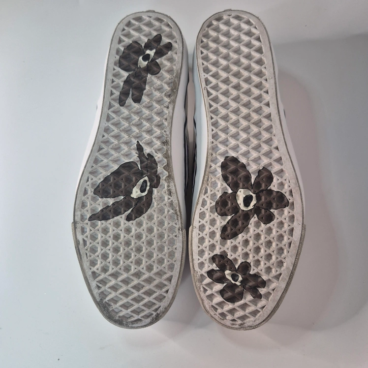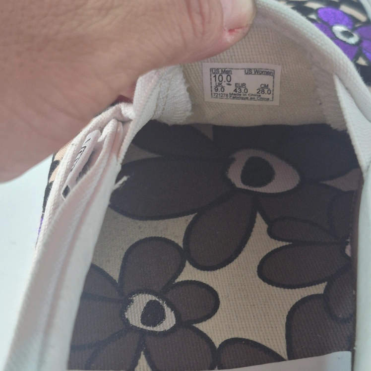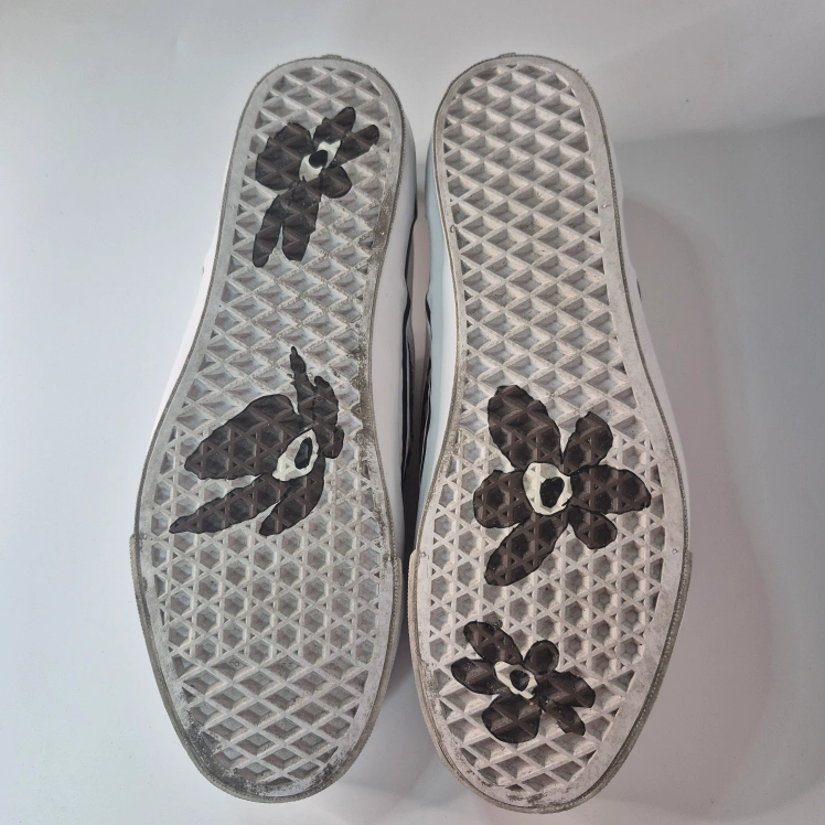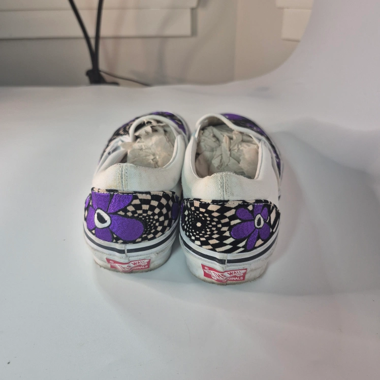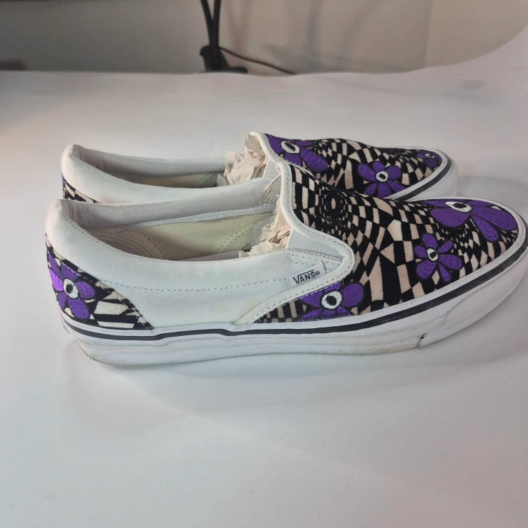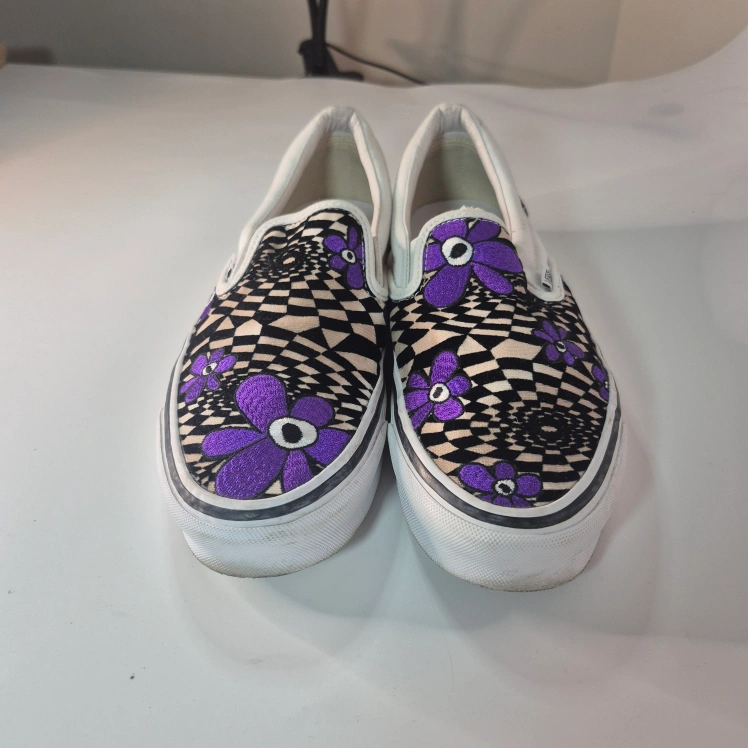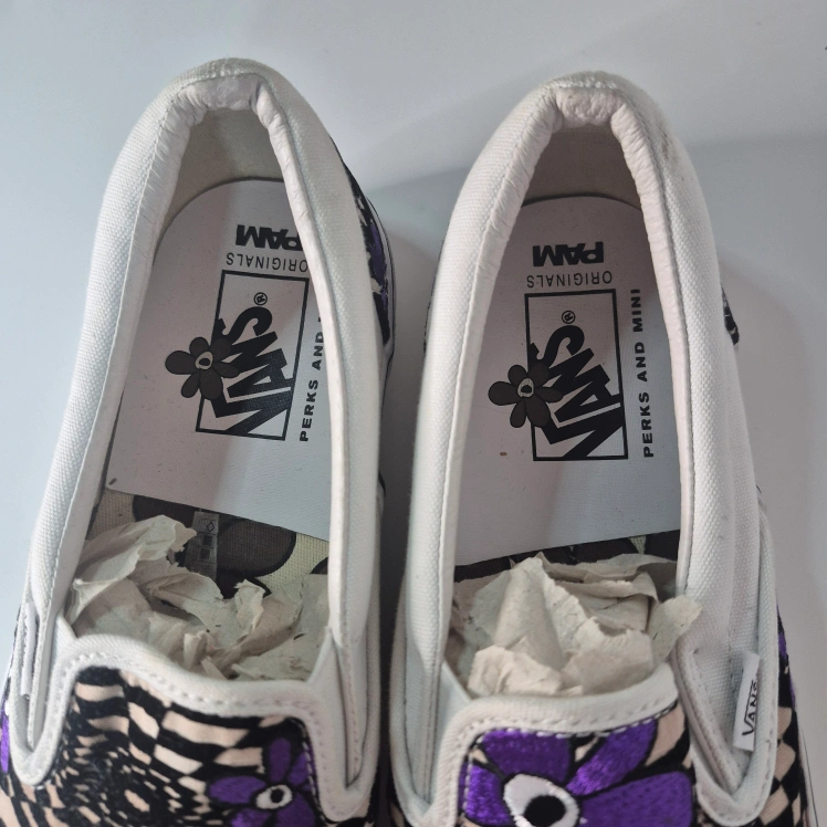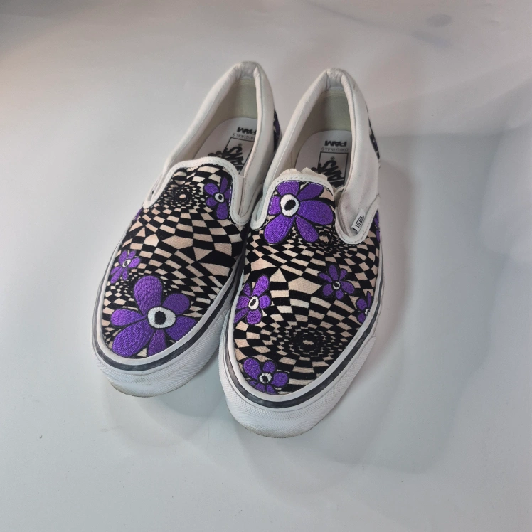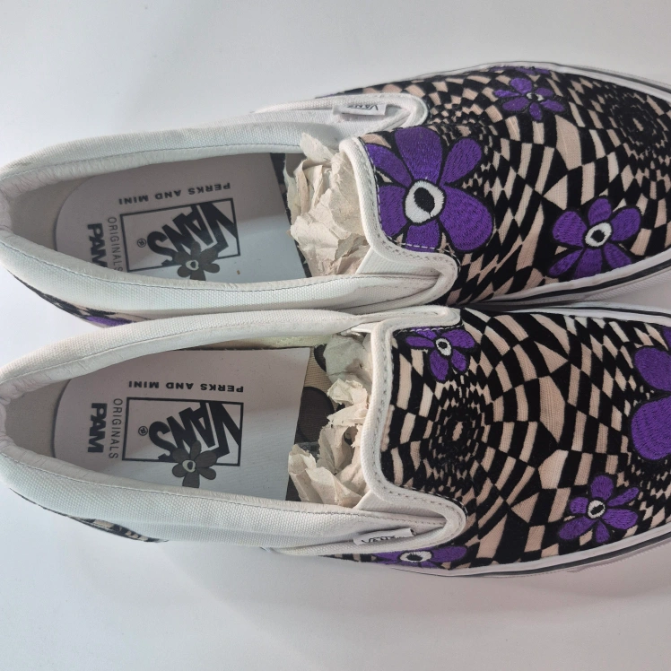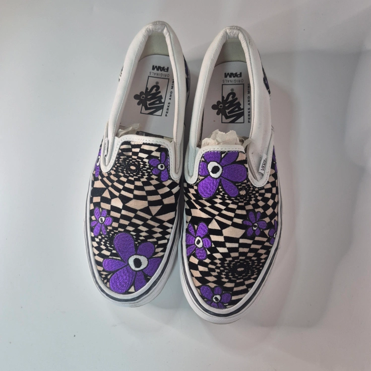 Cool Vans slip-on sneakers in a unique collaboration with PAM (Perks and Mini)! These feature a fun purple floral and checkerboard design. Perfect for adding a pop of colour to your casual outfits!