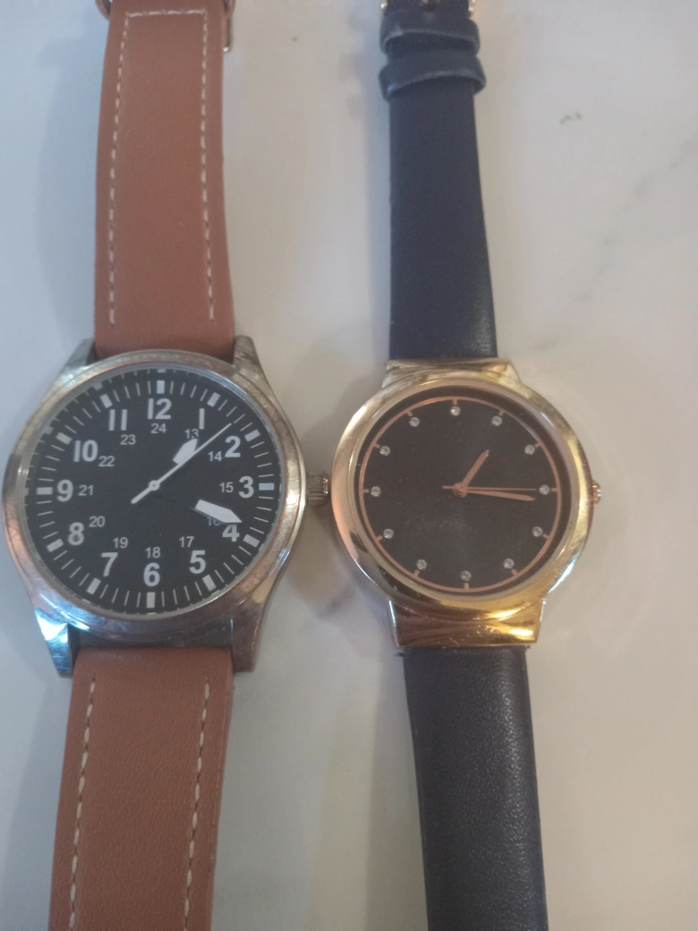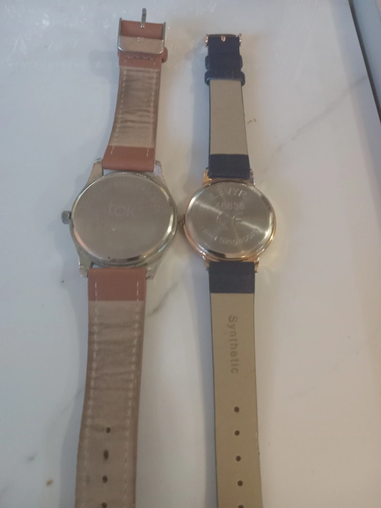 Selling a set of two watches. One is a TCK watch with a brown leather strap and a stainless steel case back. The other is a Levyr watch with a black synthetic strap and a gold-tone case.