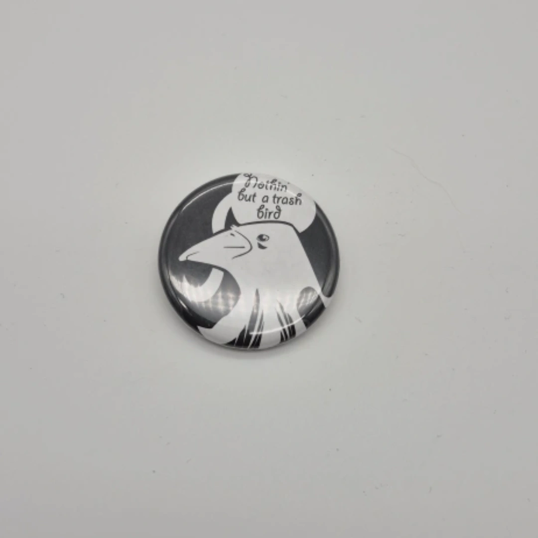 Cute pin of a bird, but make it trash! It's in great condition and ready to add some flair to your jacket, bag, or pin collection. 1.5" diameter ____ PICK-UP ONLY Weekdays: 10-12 am OR 2 -10 pm Weekends/Holidays: 11am - 9 pm