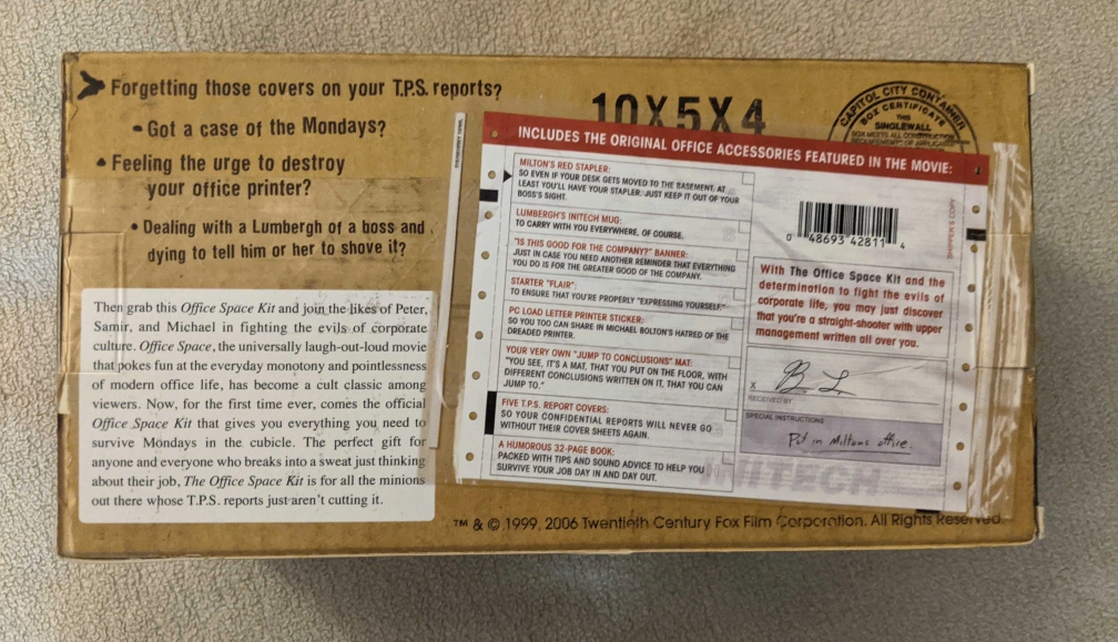 Selling an Office Space Kit! This kit is perfect for anyone who's had a case of the Mondays or feels the urge to destroy their office printer. It includes all the original office accessories featured in the movie, like Milton's red stapler and Lumbergh's Initech mug. There's even a PC load letter printer sticker and five TPS report covers. The box is included! (AI suggestion hit it pretty on the head!) Local delivery available.
