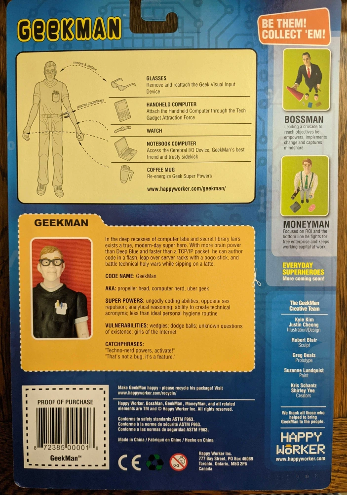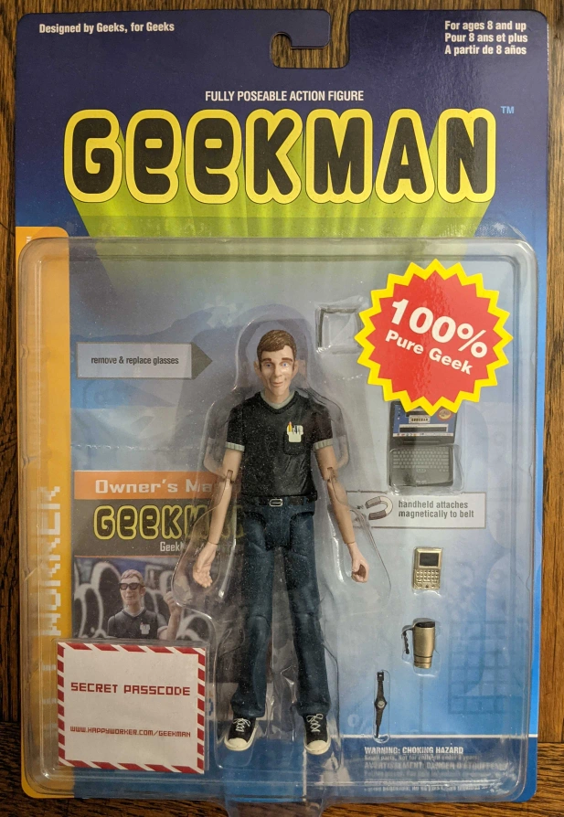 Selling a fully poseable Geekman action figure by Happy Worker. Designed by geeks, for geeks, this action figure is perfect for ages 8 and up. It comes with accessories like glasses, a handheld computer, a notebook computer, a watch, and a coffee mug. A fun collectible for any geek!