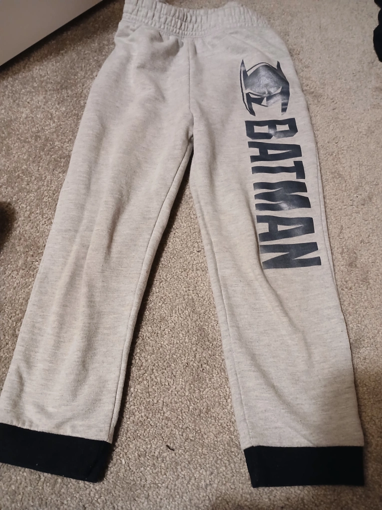Cozy grey jogger pants featuring the Batman logo. These pants have black cuffs and a comfortable elastic waistband. Perfect for lounging or playing!